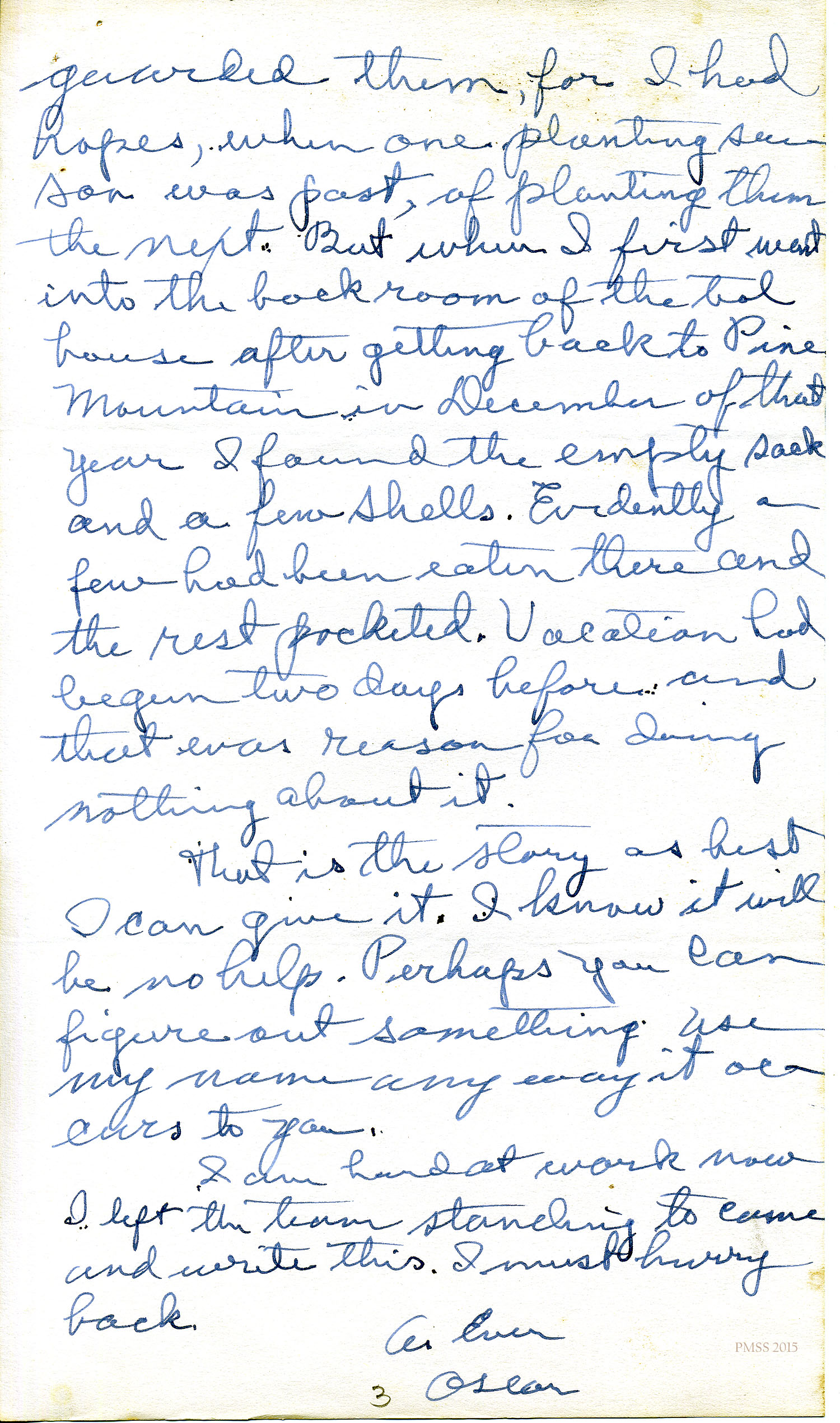 …guarded them, for I had hopes, when one planting season was past, of planting them the next. But when I first went into the back room of the tool house after getting back to Pine Mountain in December of that year I found the empty sack and a few shells. Evidently a few had been eaten there and the rest pocketed. Vacation had begun two days before and that was reason for doing nothing about it.