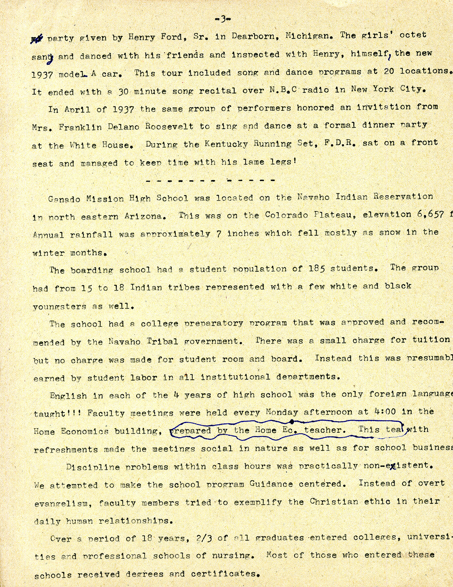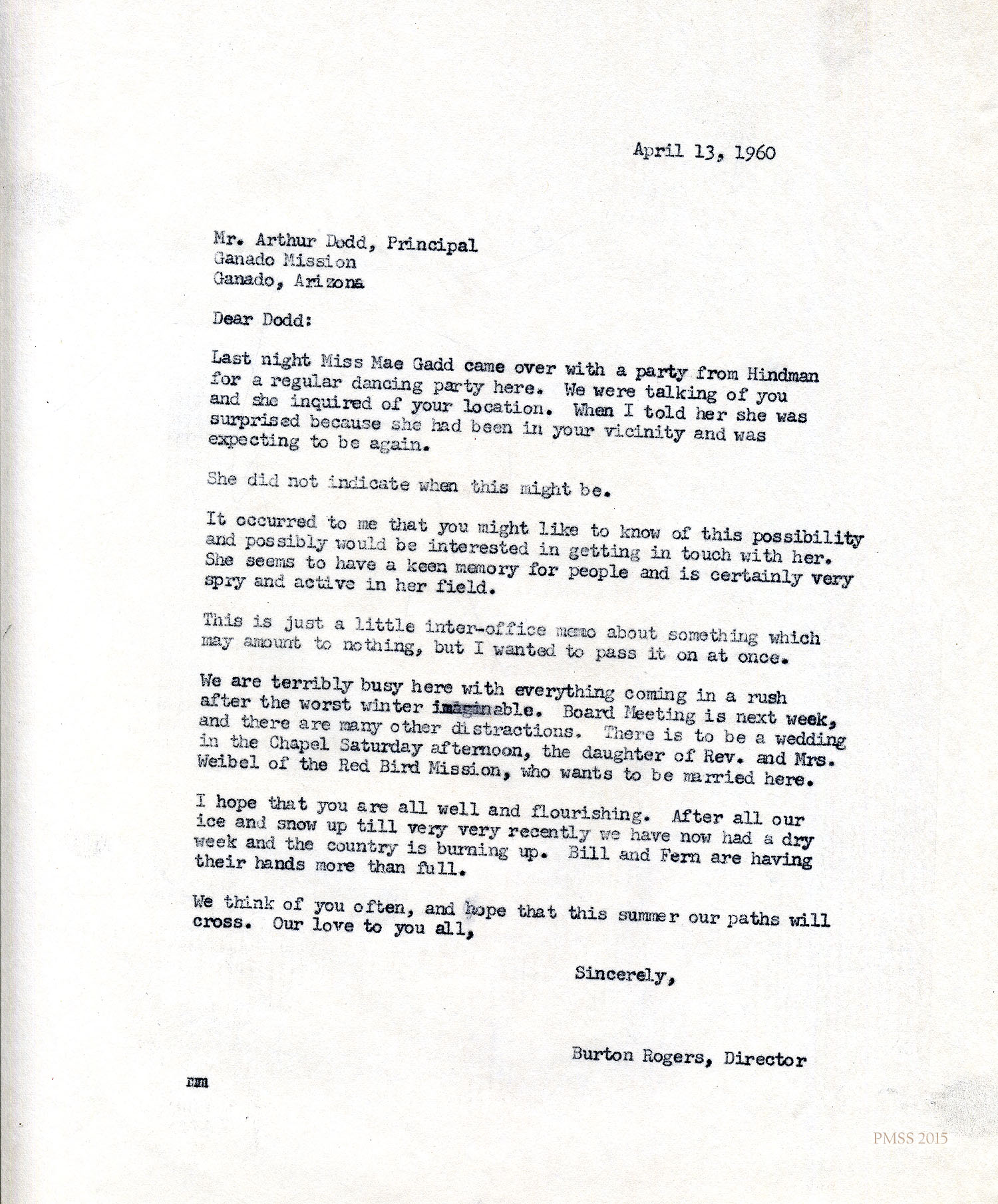 Dodd (Ganado Mission letterhead) to “Burton” (Rogers): Plans to travel to KY, then CA with the Weekes family; Shepherd School ; Navajo children; visual education; opaque projector; graduating 20 Navajo, Hopis, and Lagunas; Margaret’s piano recital; invites Rogers to visit.