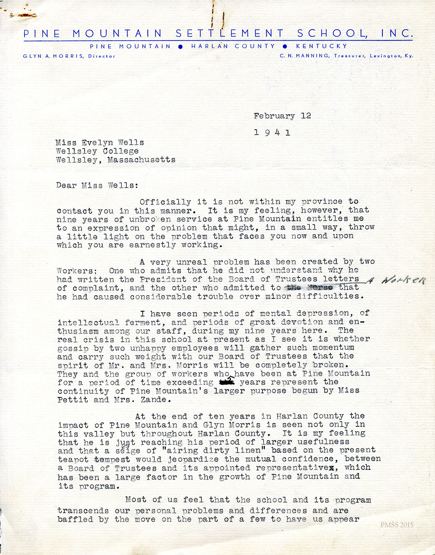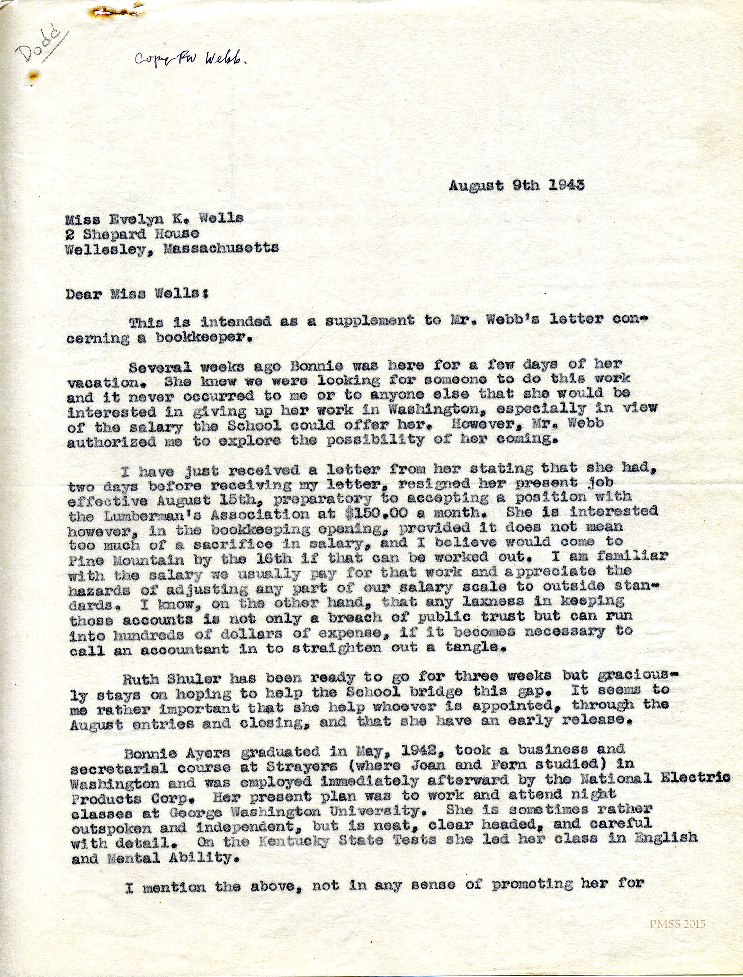 [unsigned] to Evelyn K. Wells in Wellesley, MA: Possibility of hiring Bonnie Ayers as bookkeeper; Ruth Shuler; Ayers’ credentials; Appointments Committee.