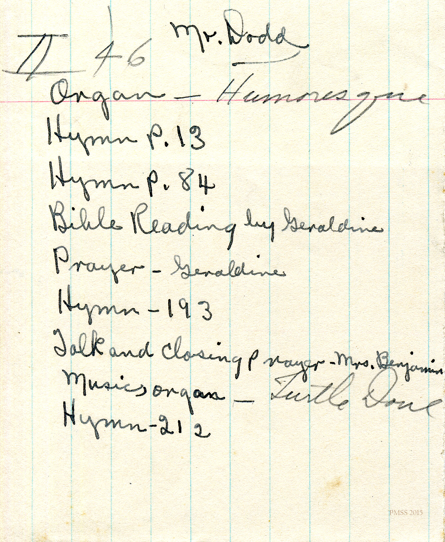 Handwritten note listing organ music, hymn pages, prayer reading by Geraldine, and talk and closing prayer by Mrs. Benjamin.