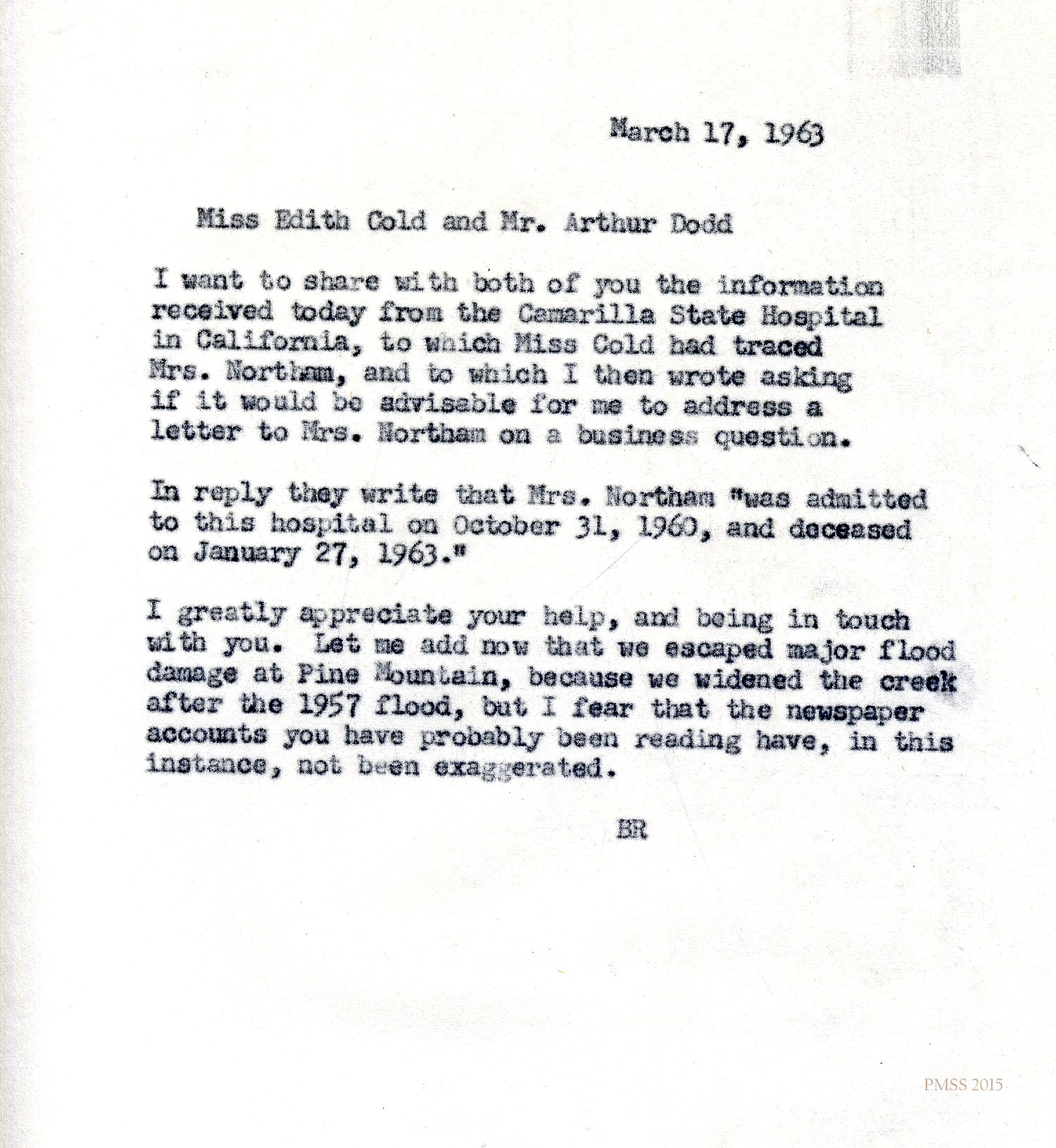 “BR” [Burton Rogers] to Miss Edith Cold and Dodd: Received information from Camarilla (CA) State Hospital that Mrs. Northam died on January 27, 1963; flooding at PMSS.