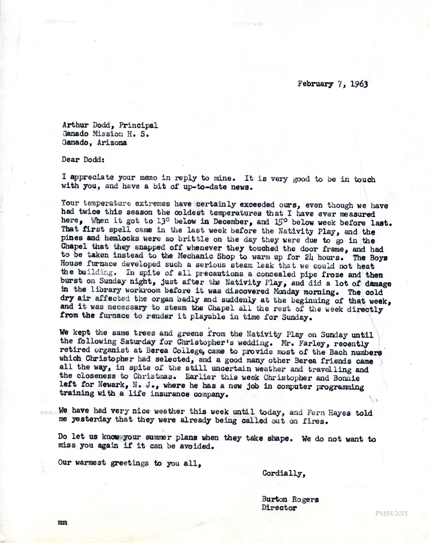 Burton Rogers, Director, to Arthur Dodd, Principal at Ganado (AZ) Mission H.S.: Cold weather problems; Christopher and Bonnie’s wedding; Newark, NJ, computer programming training; Mr. Farley (retired Berea organist).