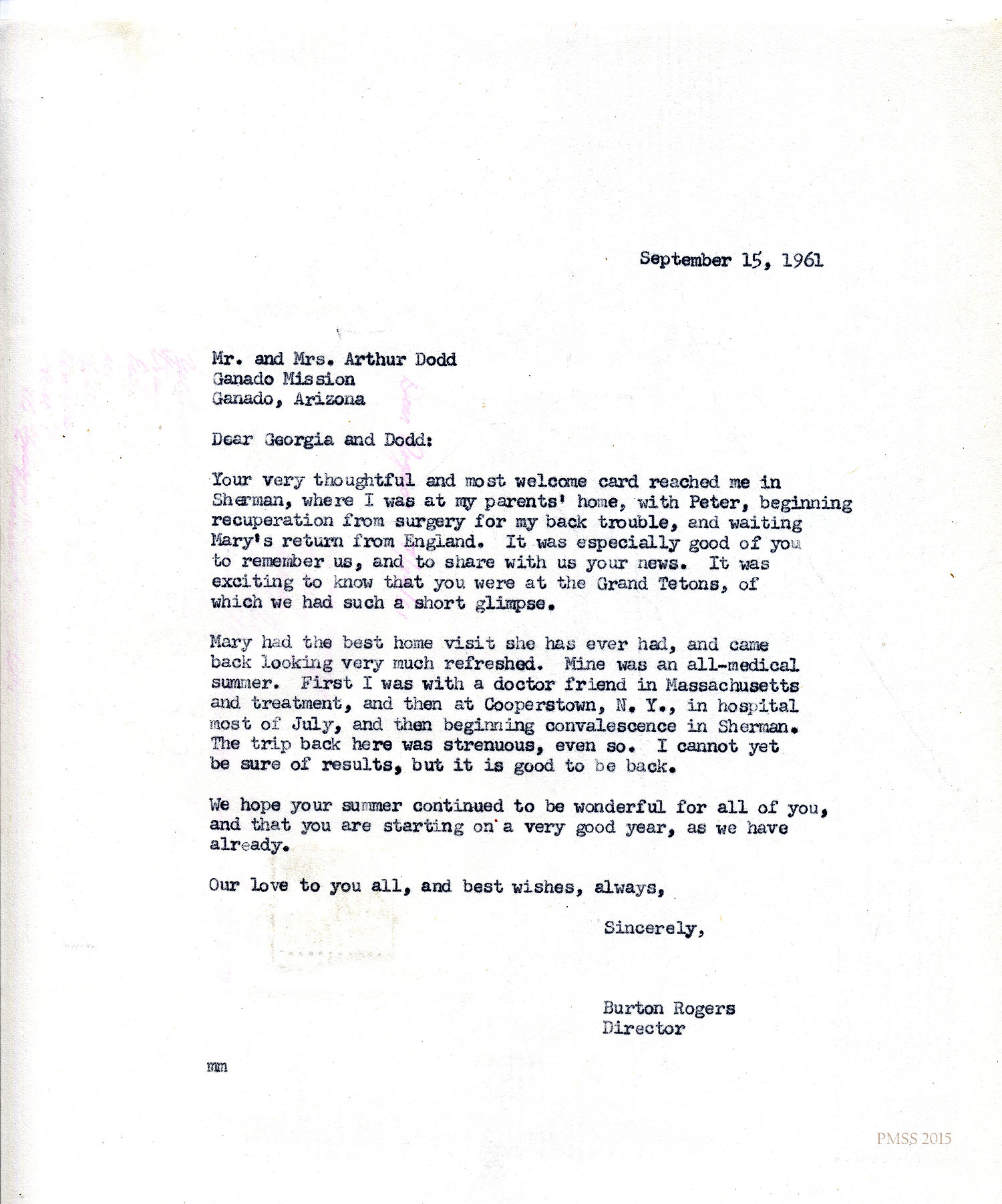 Rogers (in Sherman, CT, with Peter) to “Georgia and Dodd”: Thanks Dodd for card; Mary (Rogers)’s visit in England; back surgery.