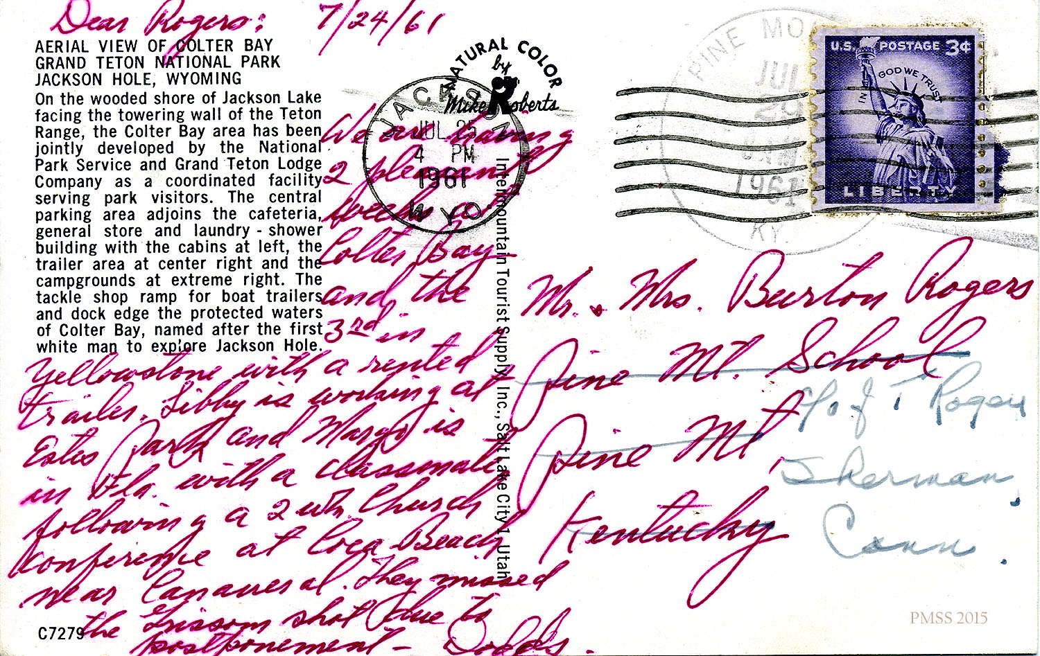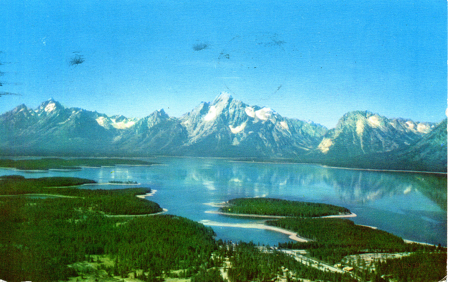 Color postal card of Grand Tetons and Colter Bay, Wyoming. Note from the “Dodds” to Rogers: Describes their travels; Libby; Margo.