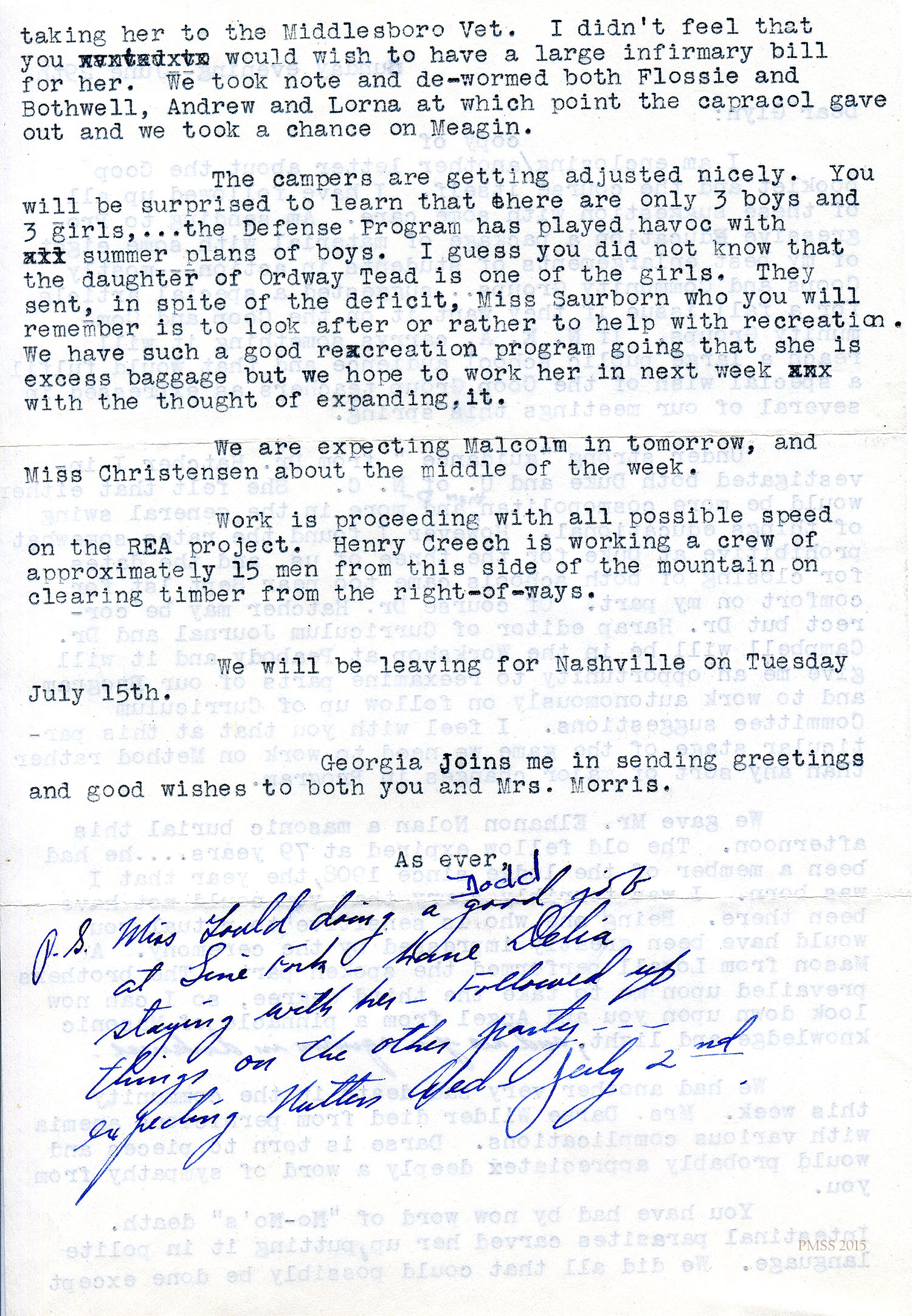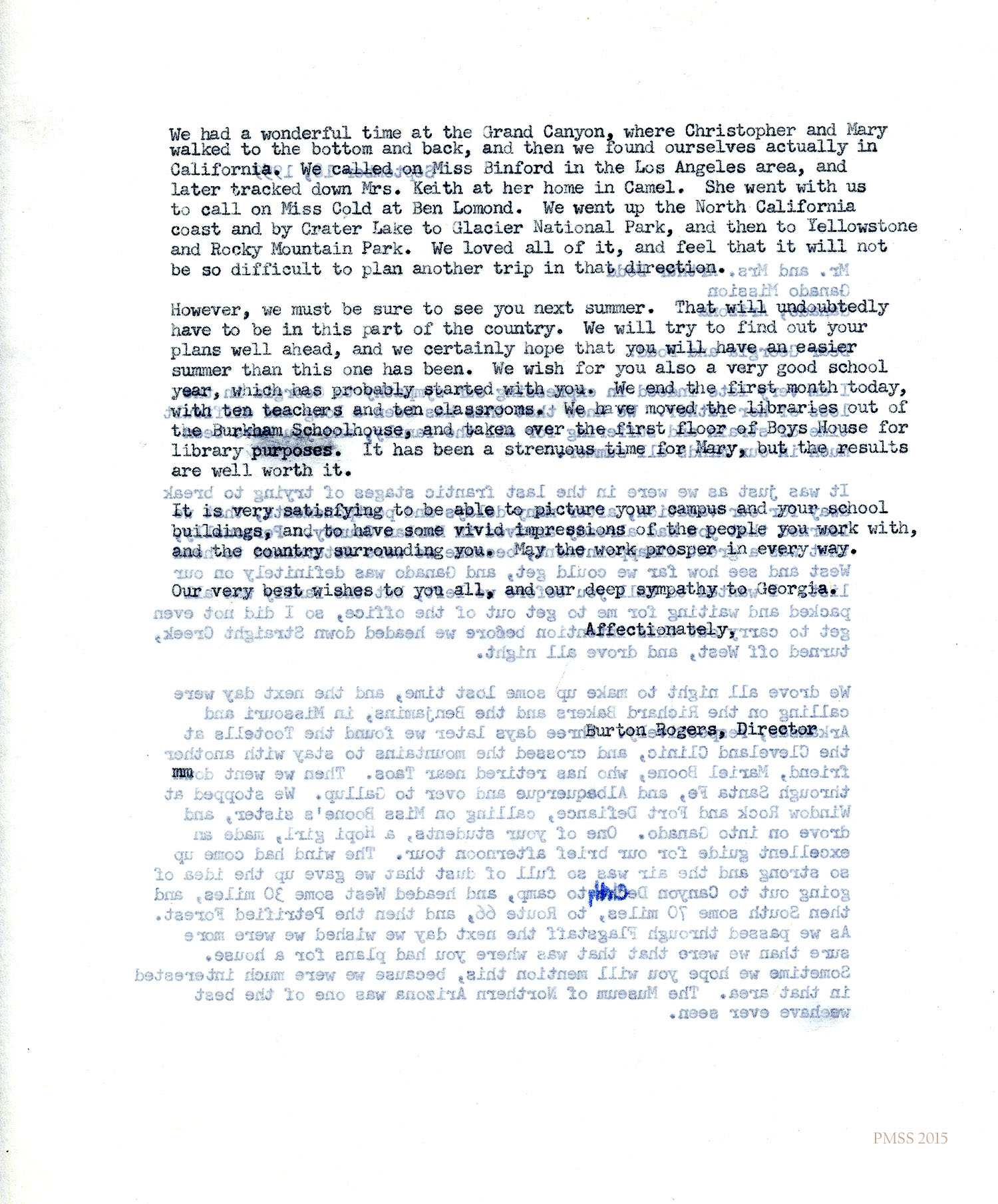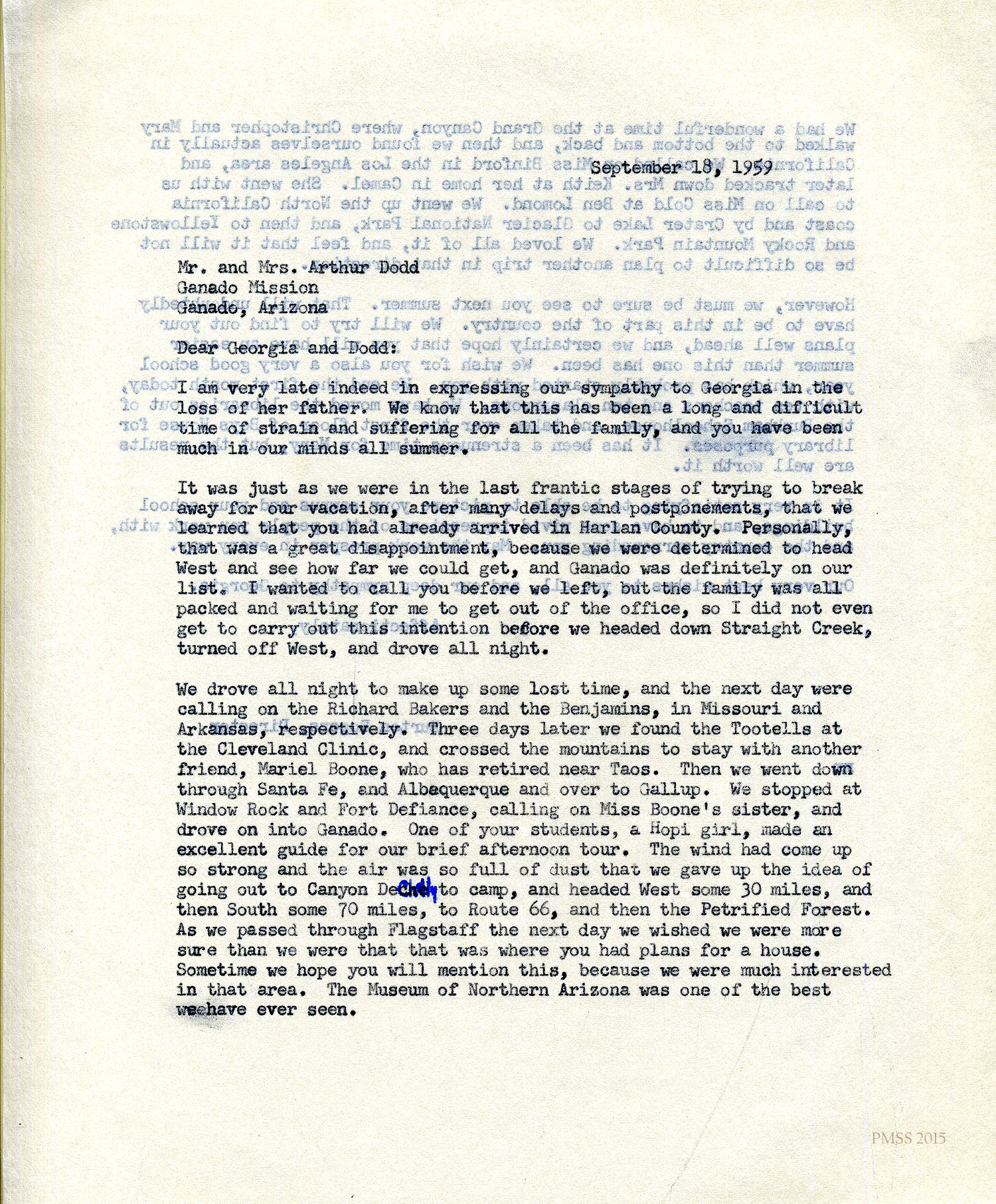 Rogers to “Georgia and Dodd”: Sympathy for Georgia whose father died ; missed Dodd’s visit to Harlan Co.; describes travel in west US; visited Richard Bakers in AR, (H.R.S.) Benjamins in MO, Tootells at Cleveland Clinic, Mariel Boone in NM, Miss Binford in CA, Mrs. Keith in Camel, Miss Cold at Ben Lomond; Ganado, NM; PMSS updates.