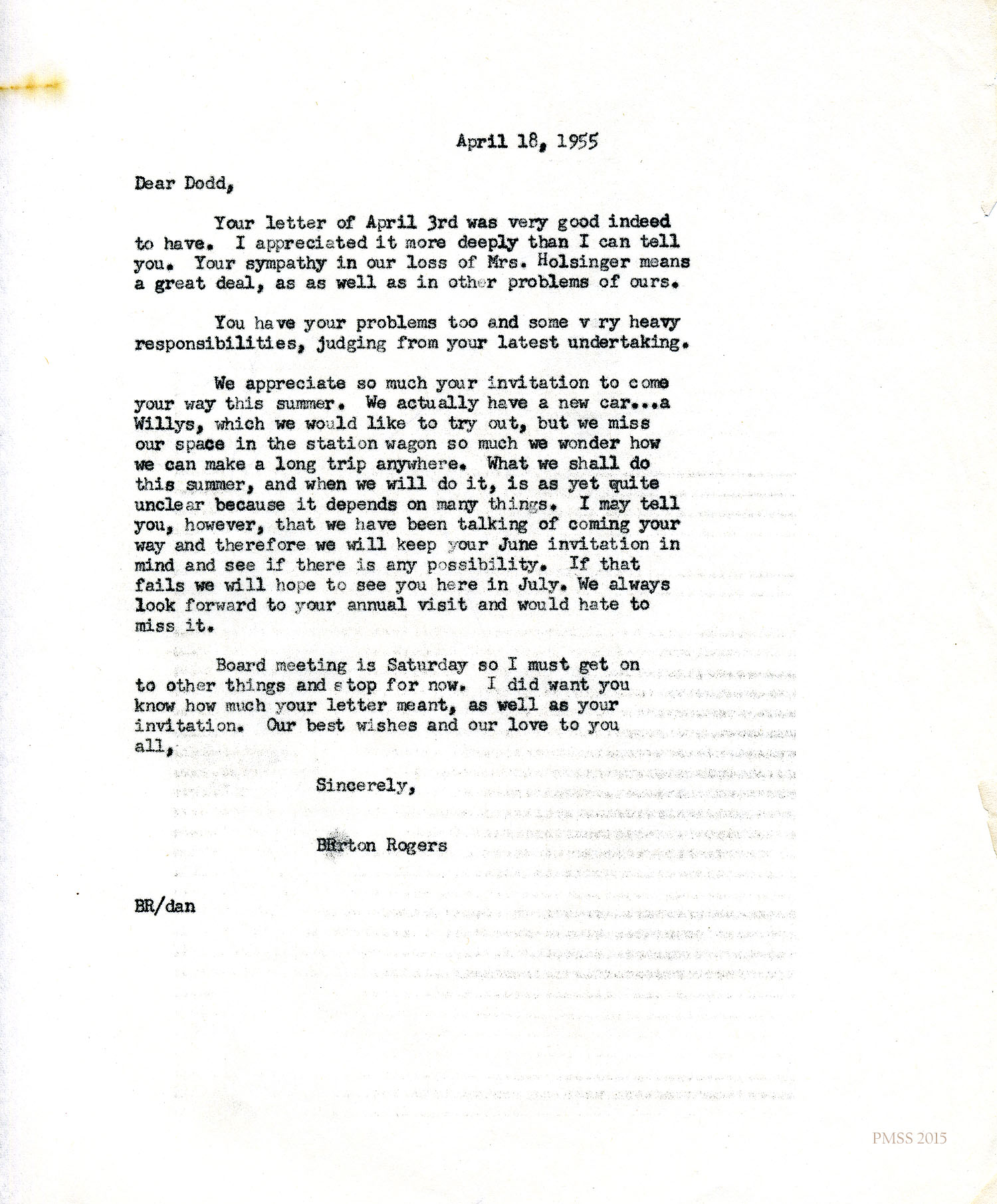 Rogers to Dodd: Mrs. Holsinger’s death; Dodd’s invitation to visit.