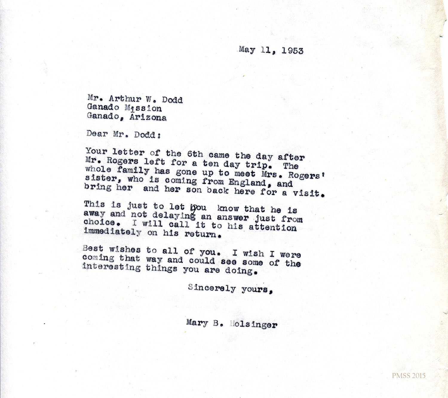 Mary B. Holsinger to Dodd: Rogers family is on a trip to meet Mrs. Rogers’ sister (Eva) and son from England.