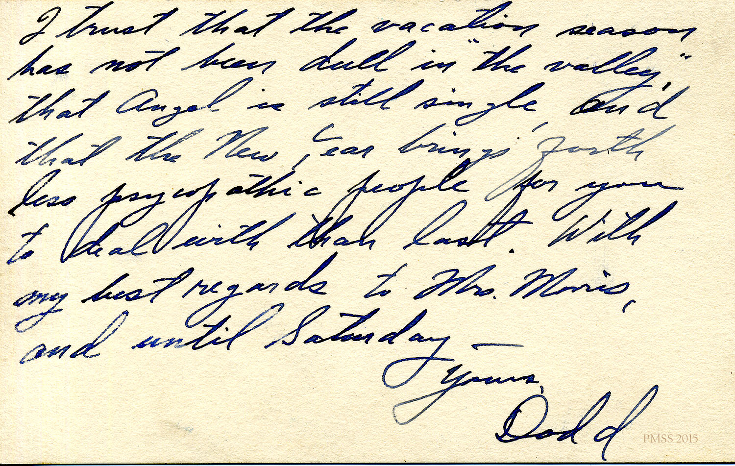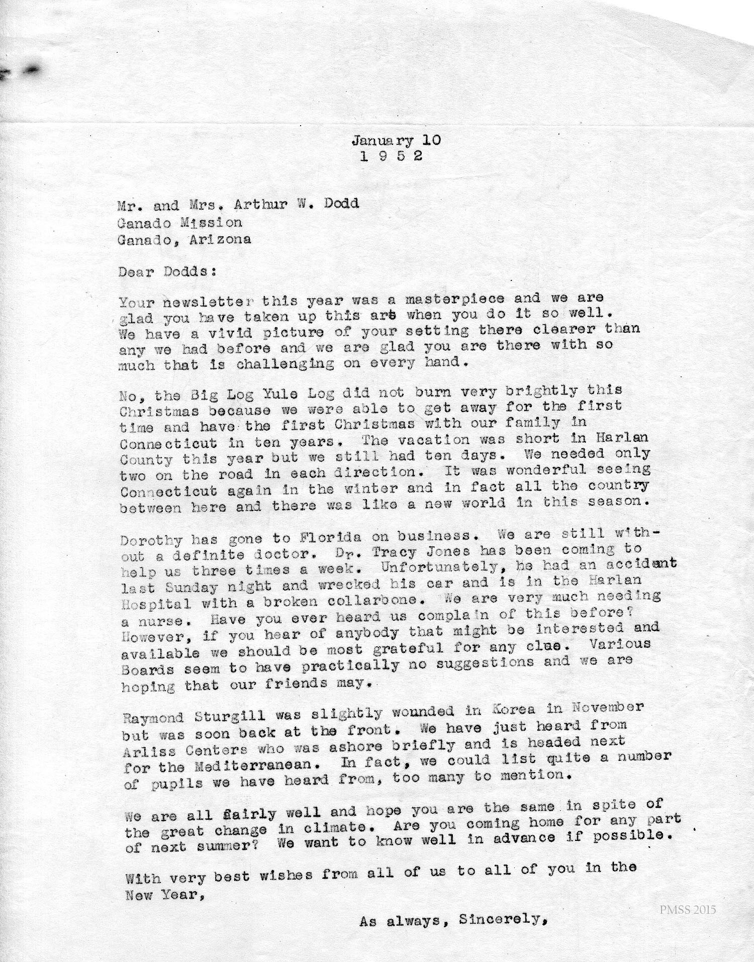 [unsigned] to “Dodds”: Appreciates Dodds newsletter; Christmas vacation in CT; Dorothy in FL; Dr. Tracy Jones to help at PMSS; Raymond Sturgill wounded in Korea; Arliss Centers.