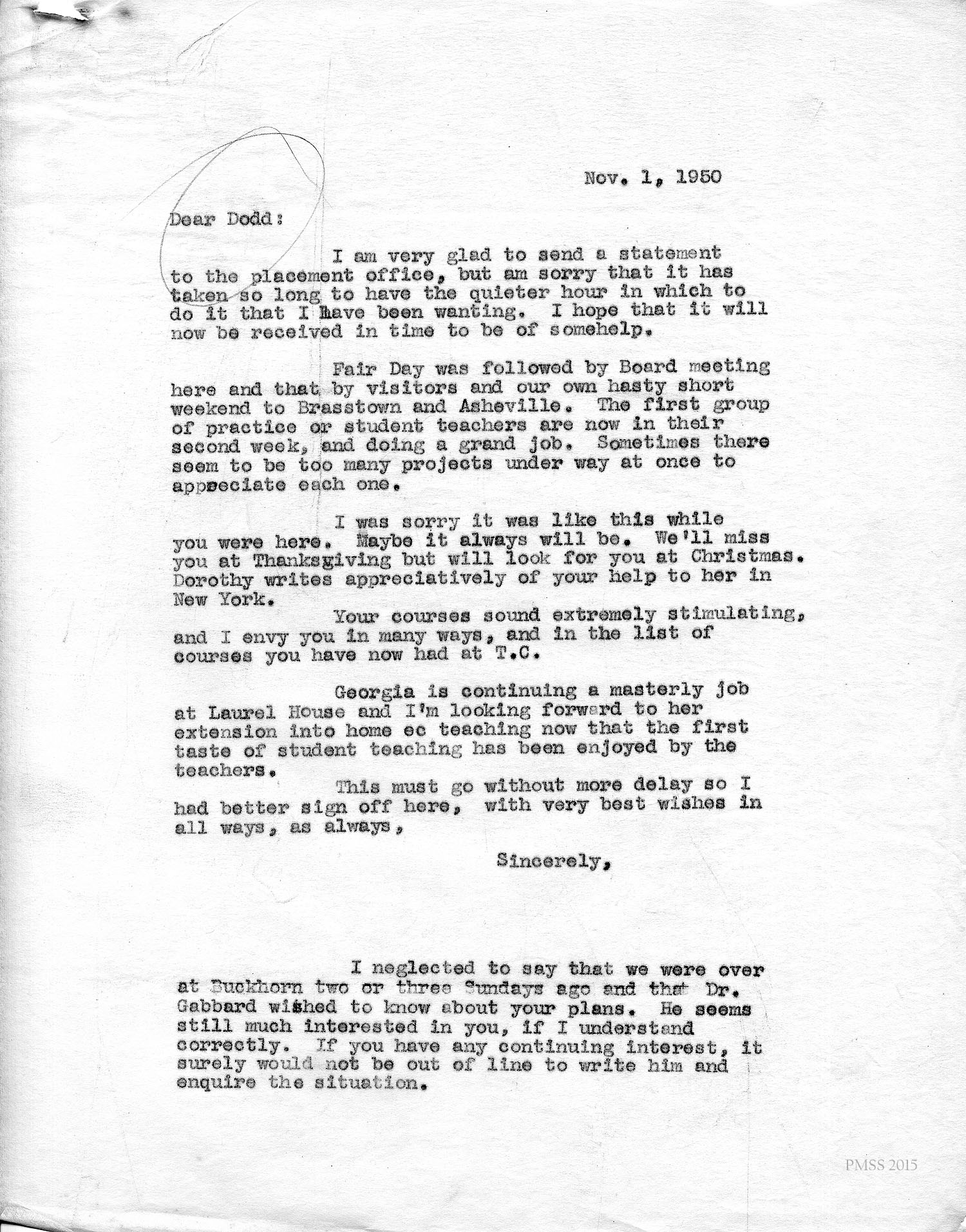 [unsigned] to Dodd: Sent statement to placement office; PMSS updates; Georgia’s work at Laurel House, home ec teaching; Dr. Gabbard at Buckhorn.