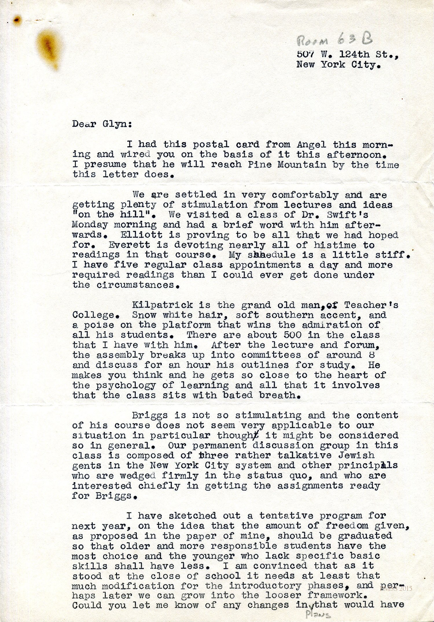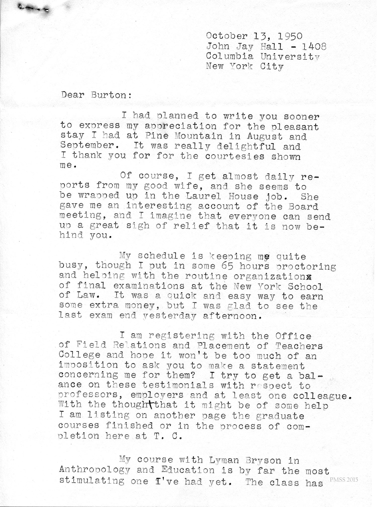 Dodd at Columbia Univ., NYC, to “Burton” (Rogers): Appreciates PMSS visit in Aug and Sept; describes proctoring at NY School of Law; asks Rogers to send statement to Office of Field Relations and Placement of Teachers College; describes course in Anthropology and Education; list of graduate courses Dodd has completed.
