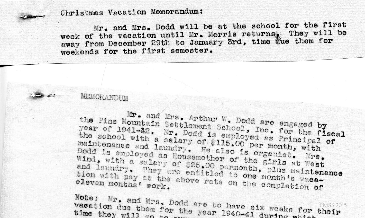 Memorandum: PMSS contract with Mr. and Mrs. Dodd for fiscal year 1941-42; handwritten note signed by Dodd indicating request for $5 a month raise (added notation: “approved”). Typewritten note with title “BIG LOG” re: scheduling.