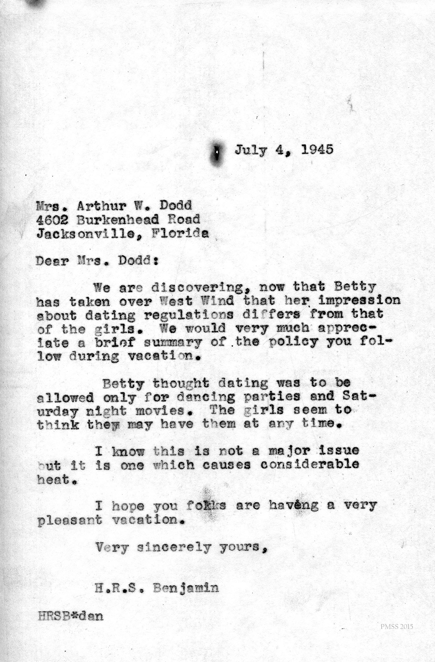 H.R.S. Benjamin (Director) to Mrs. Dodd in Jacksonville, FL: Asks Mrs. Dodd to clarify for Betty (housemother) the dating regulations for West Wind girls.
