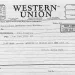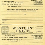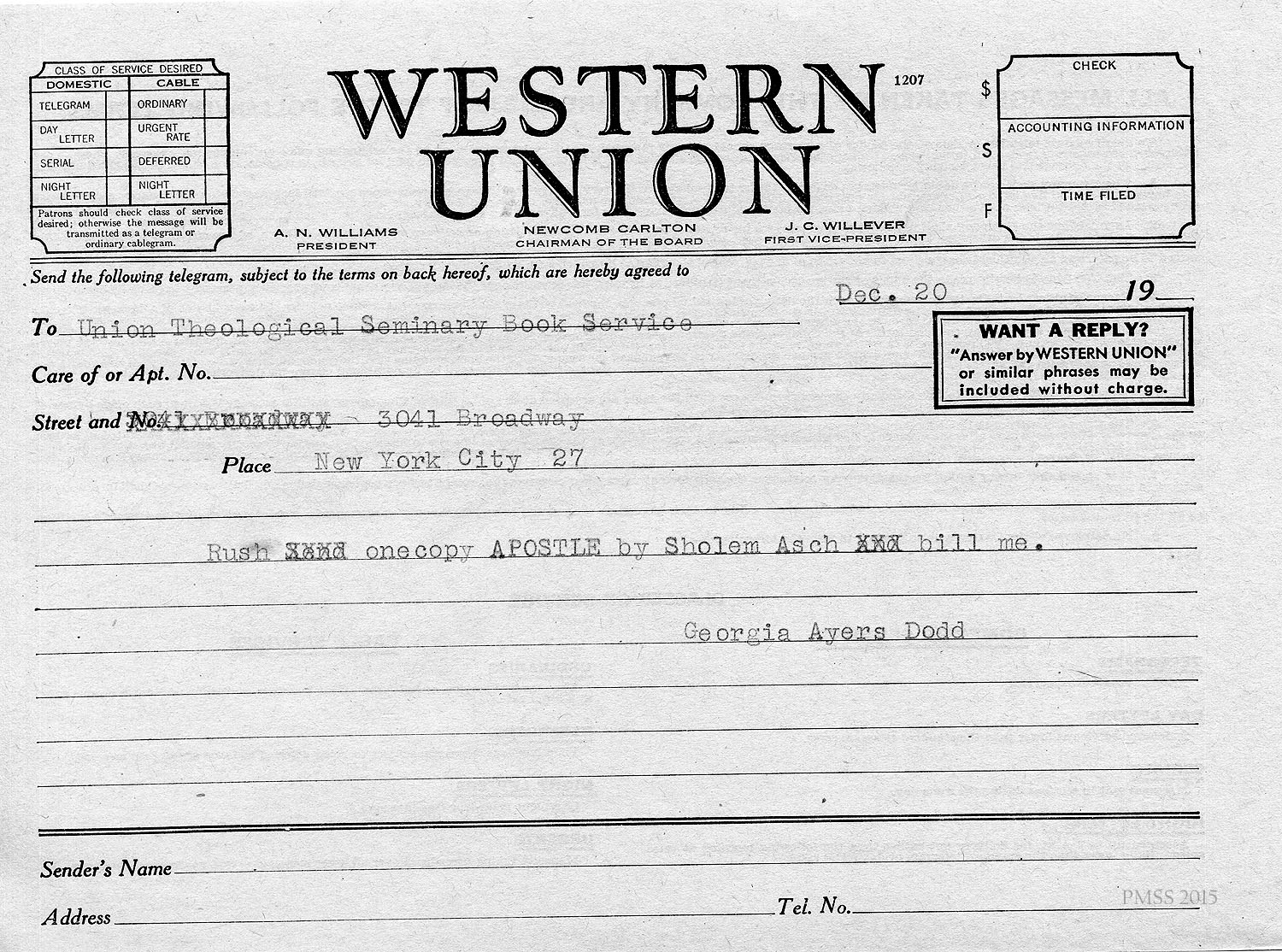 Georgia Ayers Dodd to Union Theological Seminary Book Service via Western Union: orders “Apostle” book by Sholem Asch.
