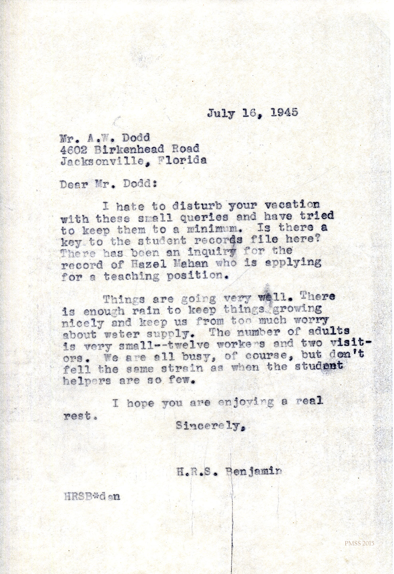 H.R.S. Benjamin (Director) to Dodd (on vacation in Jacksonville, FL): minor question.