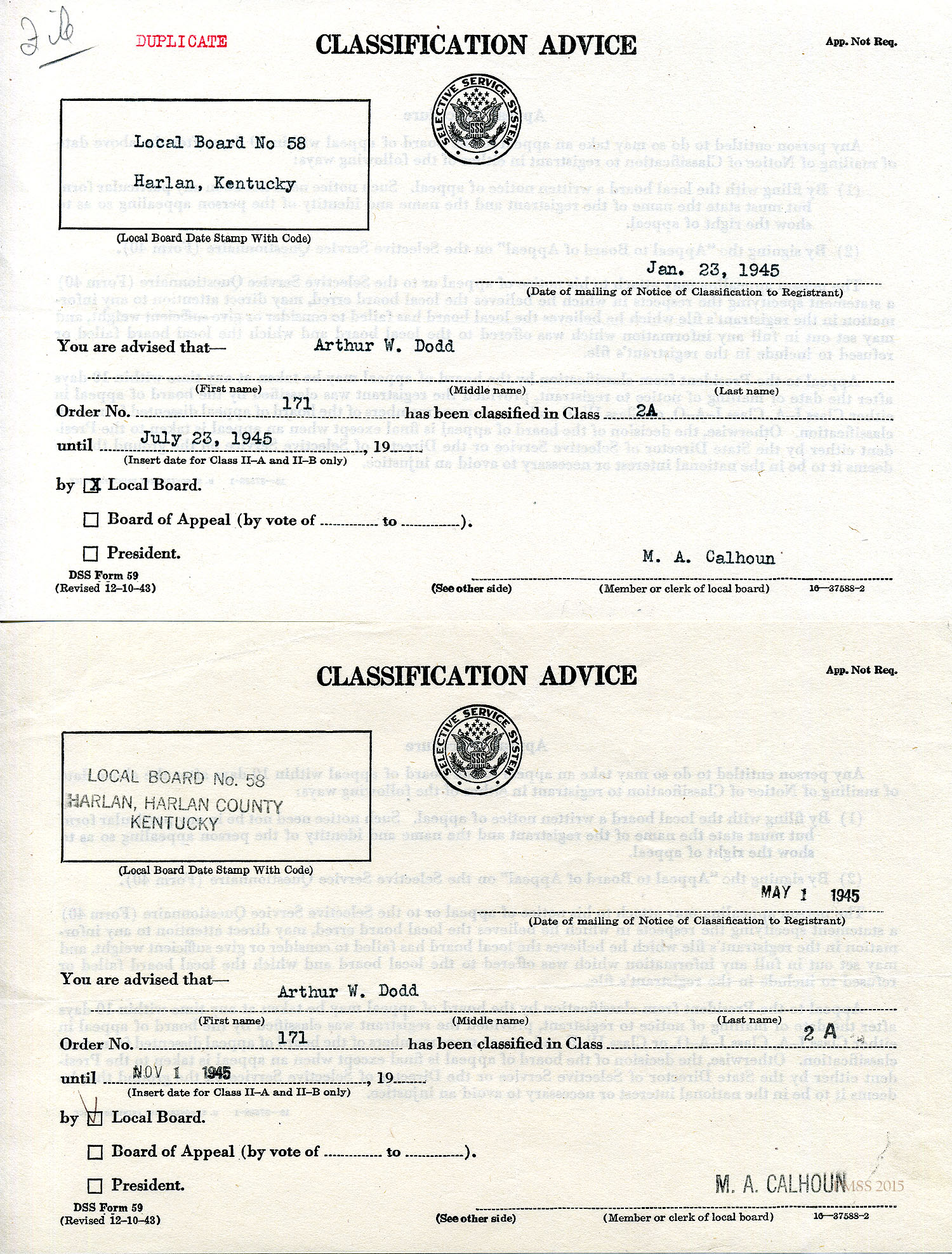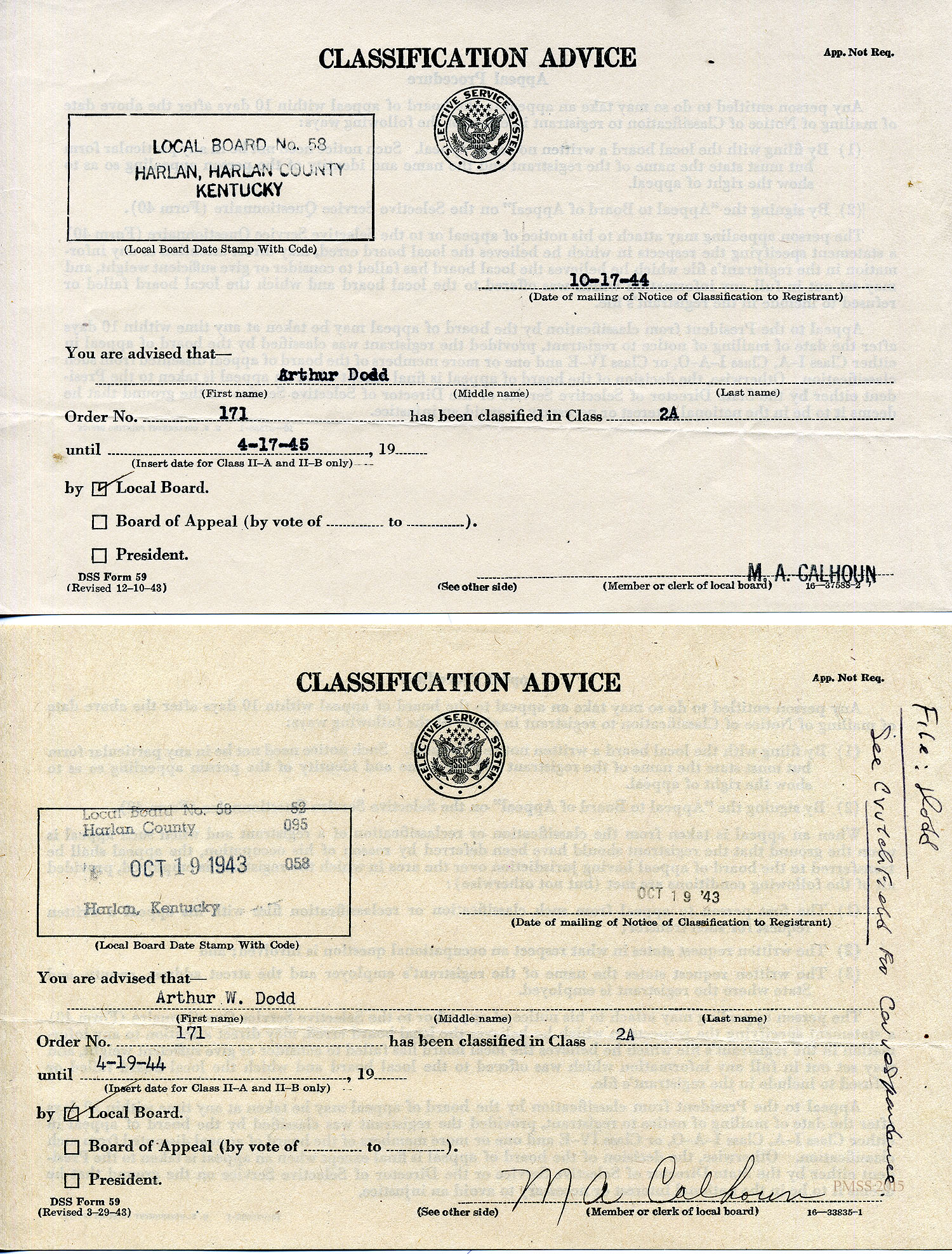 CLASSIFICATION ADVICE from Selective Service System, Local Board No. 58, Harlan, KY: Dodd’s classification for 6-month period.