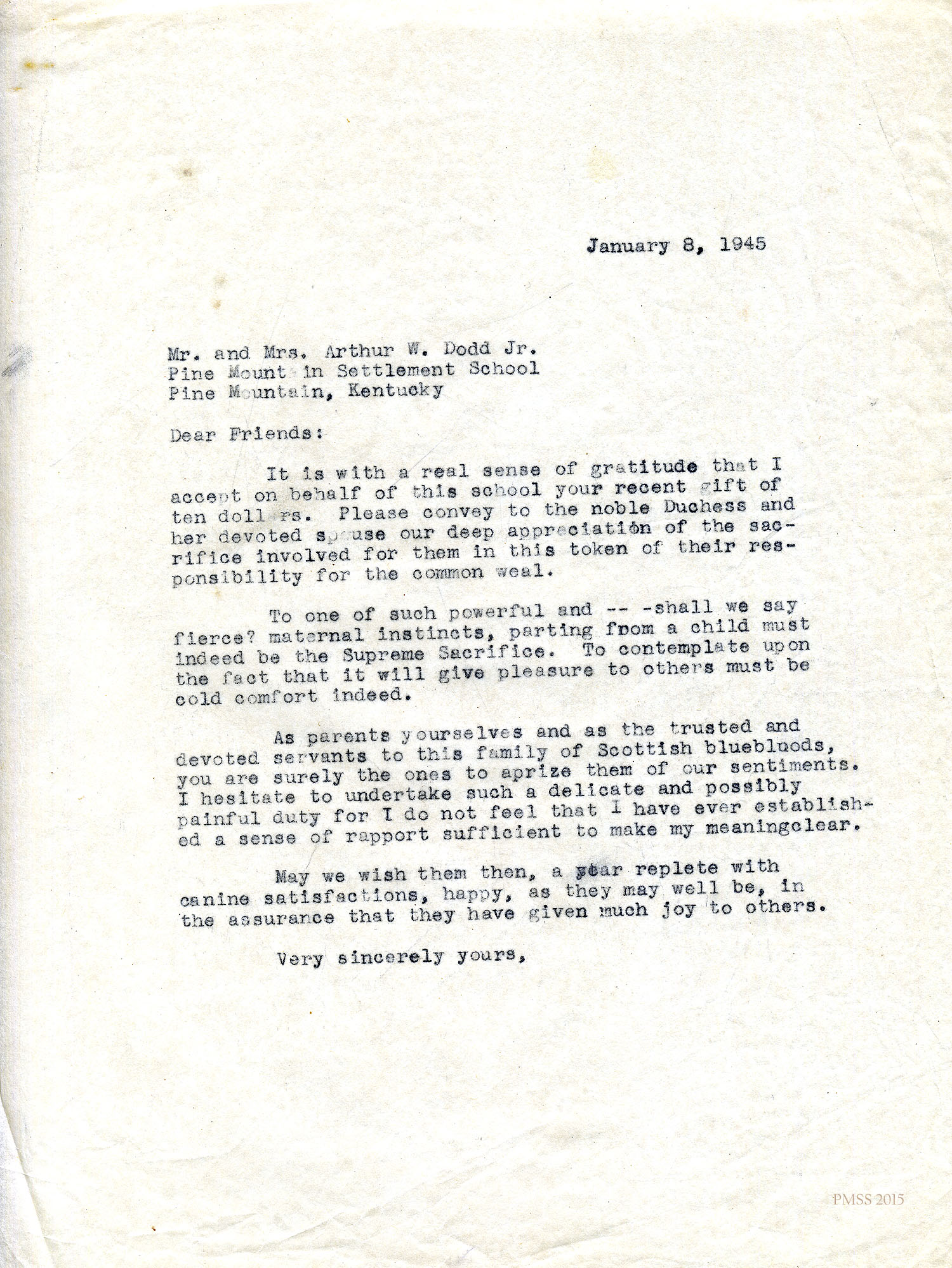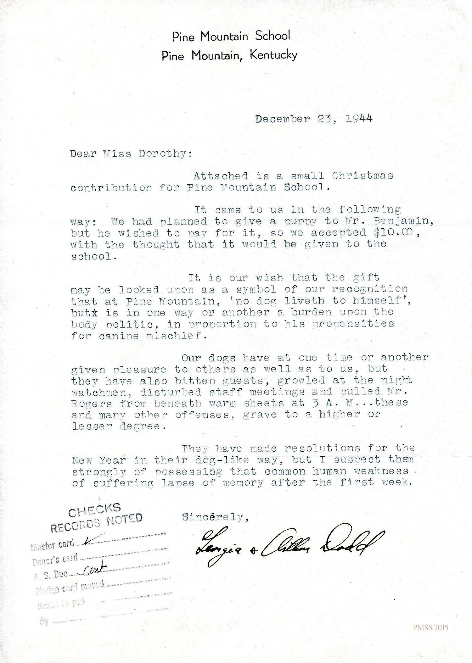 Georgia and Arthur Dodd to Miss Dorothy: Cash gift to School; dog behavior.