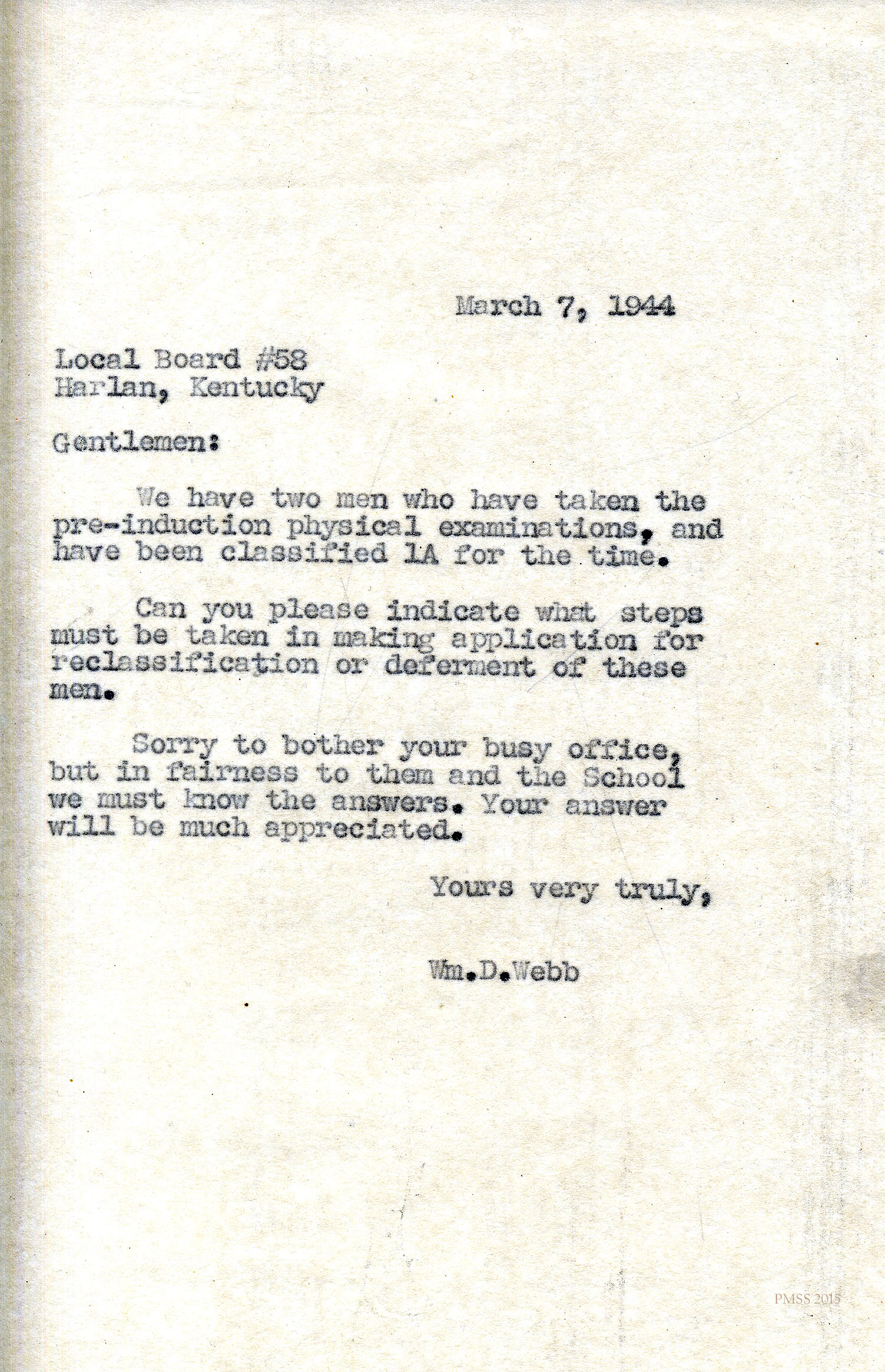 (William D.) Webb to “Gentlemen” at (Selective Service) Local Board 58, Harlan, KY: Asks how to apply for reclassification or deferment for two men (at PMSS).