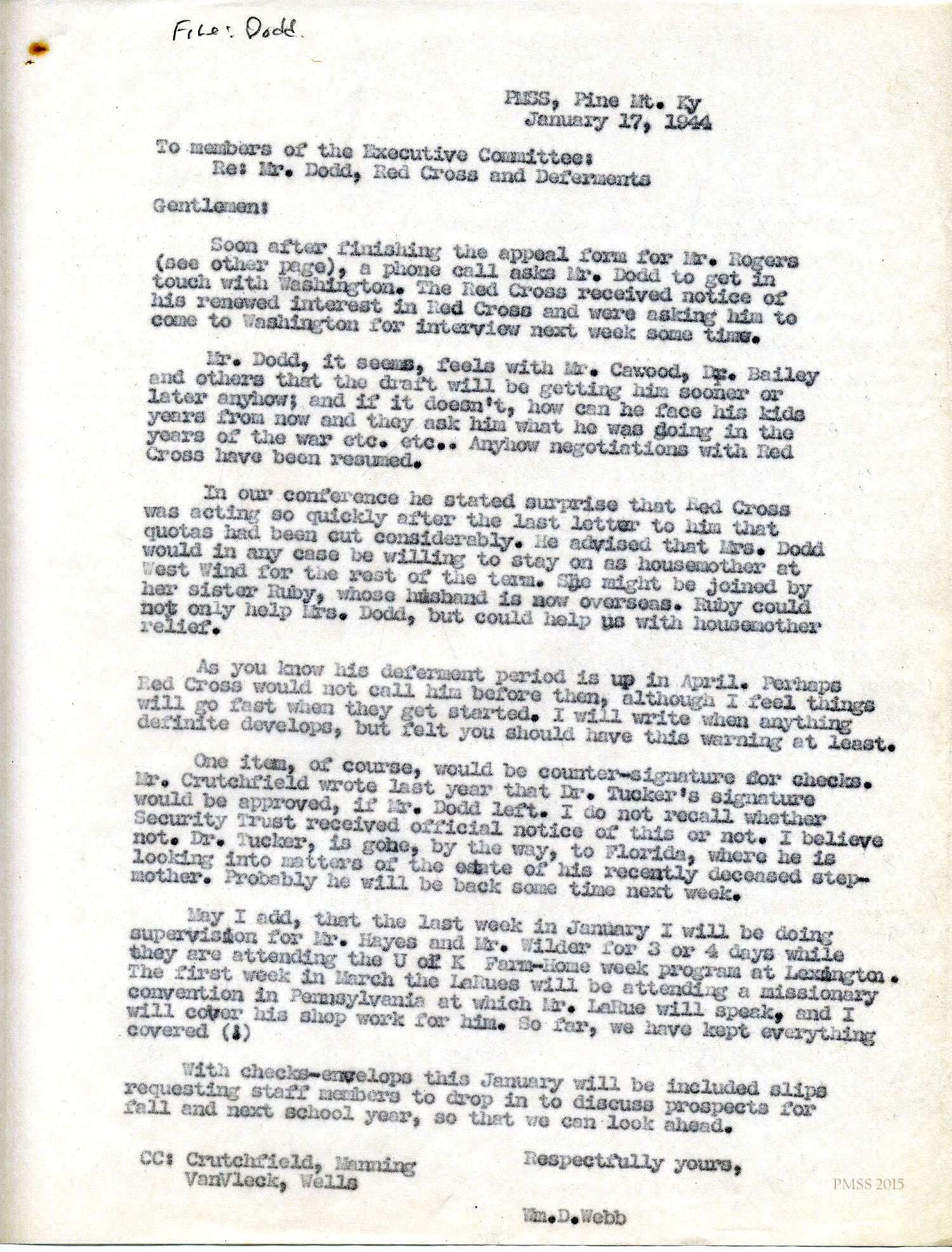 Webb to Executive Committee: re: Mr. Dodd, Red Cross and Deferments. Negotiations with Red Cross are resumed; Mrs. Dodd; Ruby Dodd, her sister; Dr. Tucker; counter-signatures; Mr. Hayes; Mr. Wilder; UK Farm-Home week; the LaRues [Dorothy and Glenn].