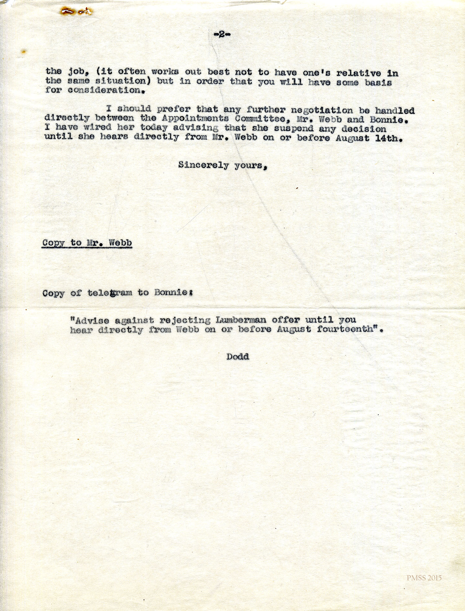 Dodd to Bonnie Ayers in Washington, DC, via Western Union: “Advise against rejecting Lumberman offer” of job until Ayers hears from Webb.