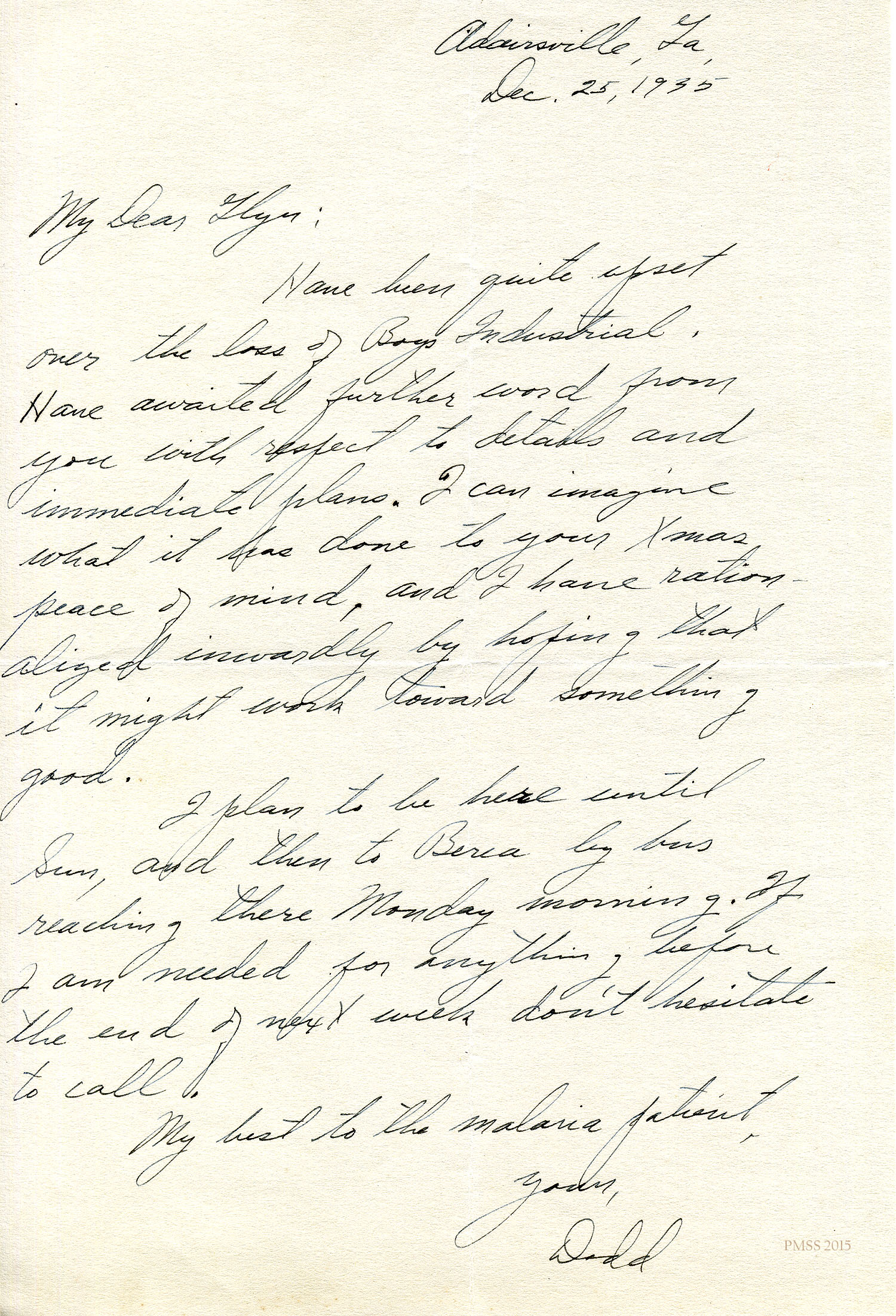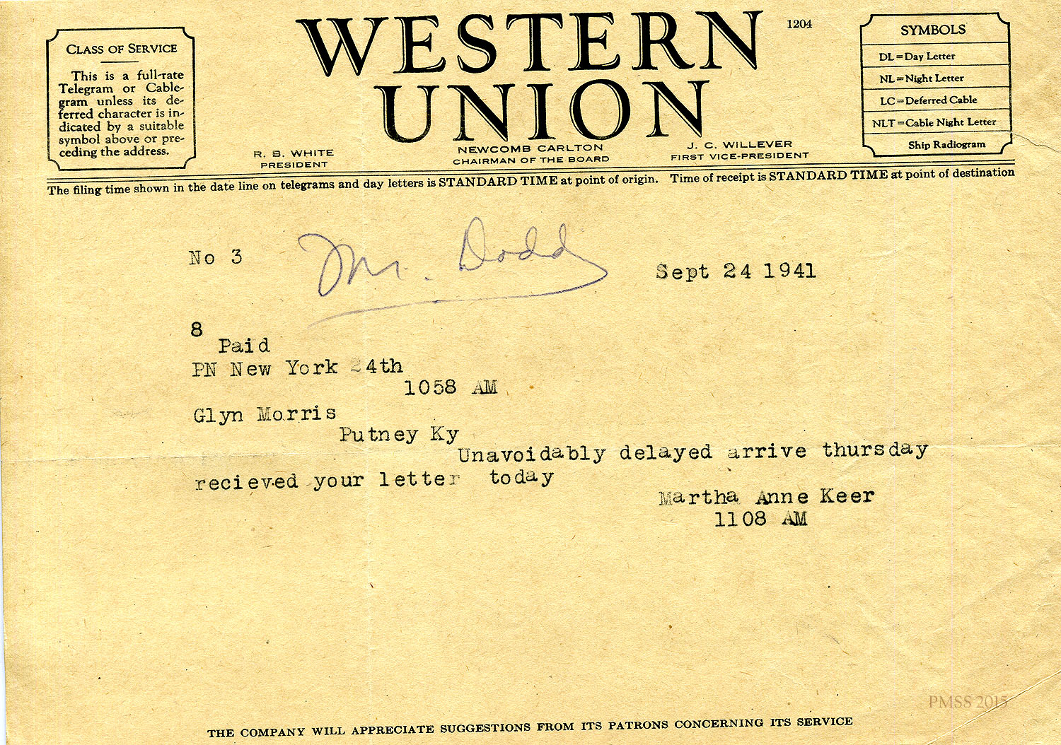 Martha Anne Keen to Morris: Delay in arrival.