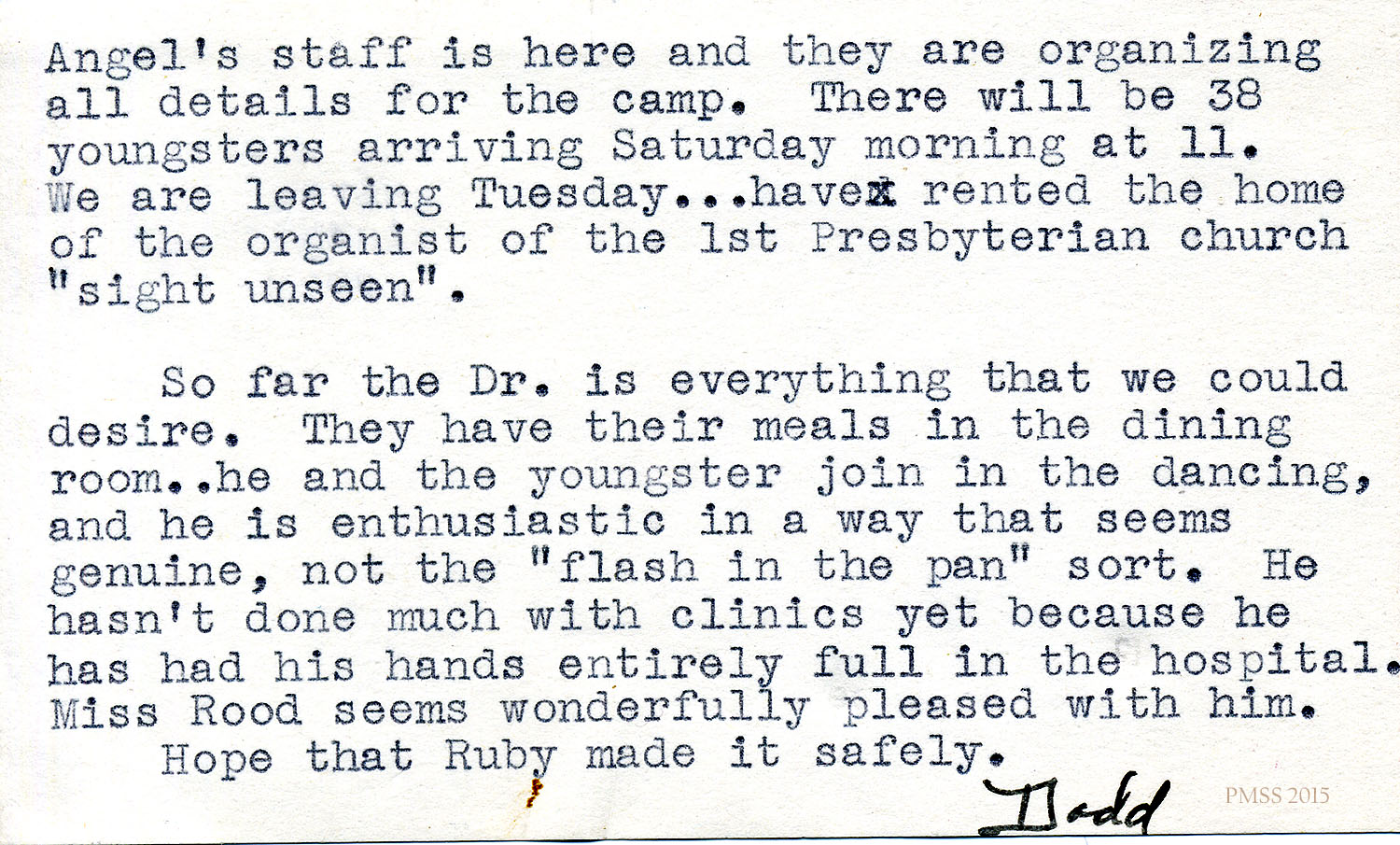 Dodd to ?: (August) Angel; camp; the doctor; Miss (Grace) Rood; Ruby.