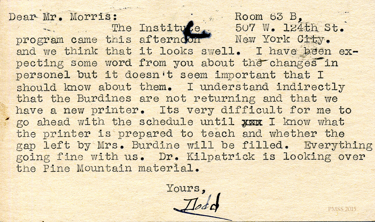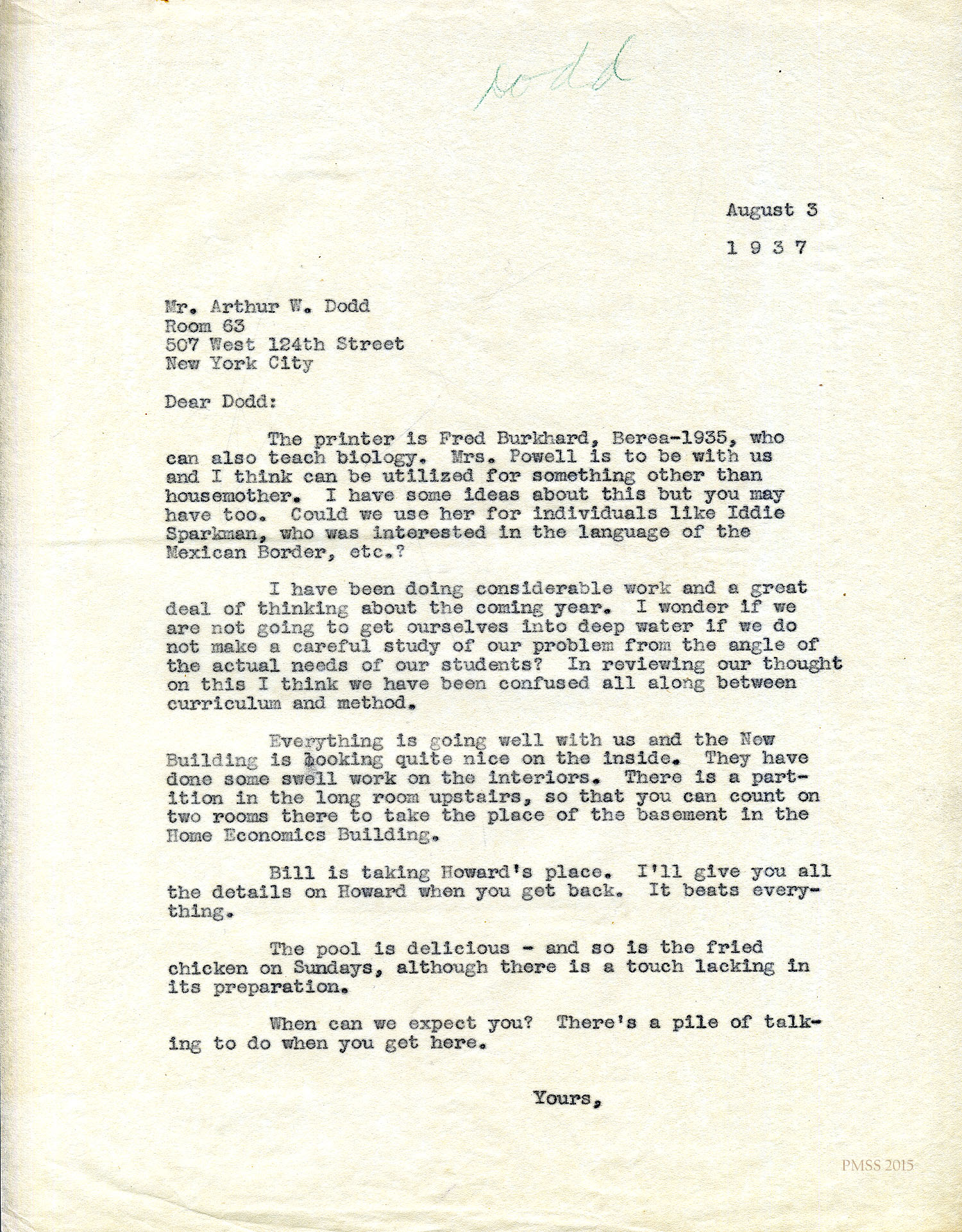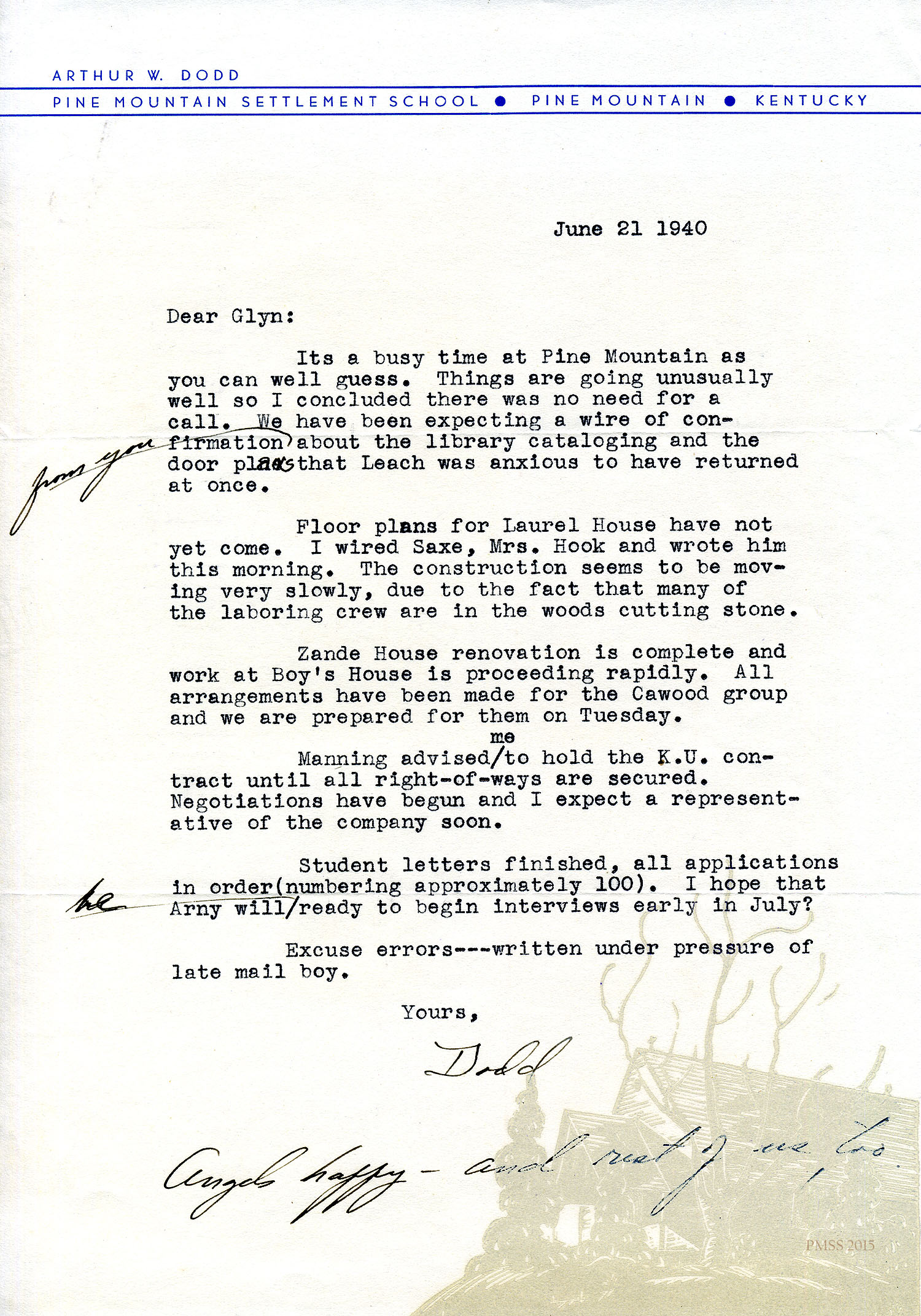 TAGS: Arthur W. Dodd Correspondence: Administrative ; Pine Mountain Settlement School ; principals ; schools ; education ; Burton Rogers ; Ganado (AZ) Mission High School ; H.R.S. Benjamin ; teaching contracts ; teachers ; printing ; William D. Webb ; community schools ; progressive education ; Guidance Institute Findings ; educational films ; Boy’s Industrial Building fire ;