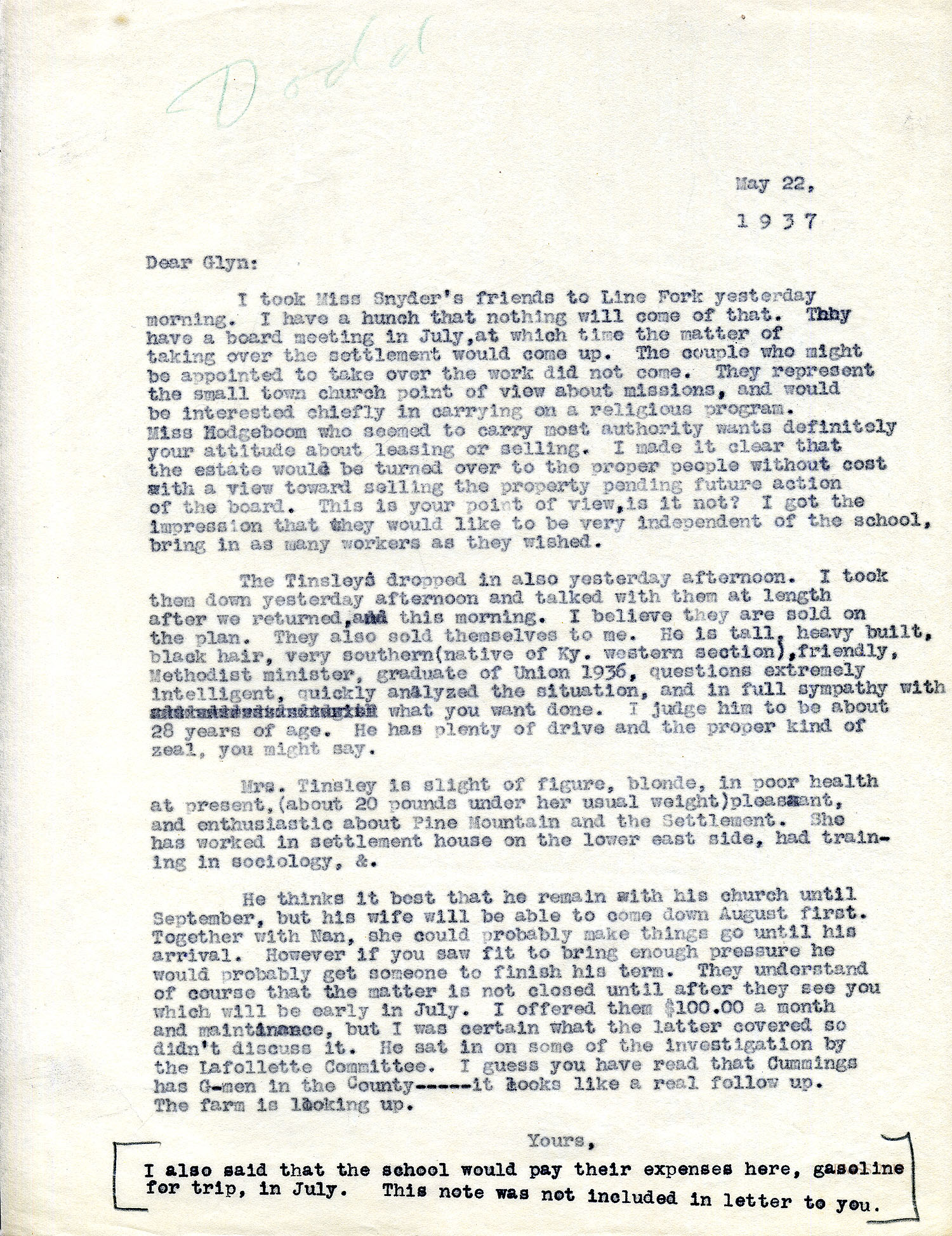 [unsigned] to Dodd: Need to discuss community school problems; Kiwanis Camp; Bothwell.