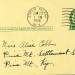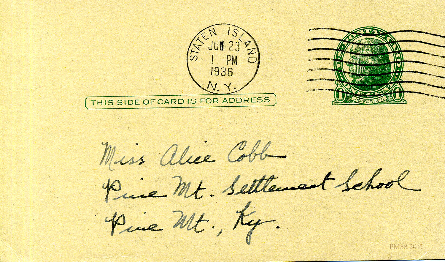 Postmark: Erie, PA, Aug 14, 1935. Addressee: Mrs. James Falkner [Barbara Faulkner) Pine Mountain Settlement School, Pine Mountain, Kentucky.