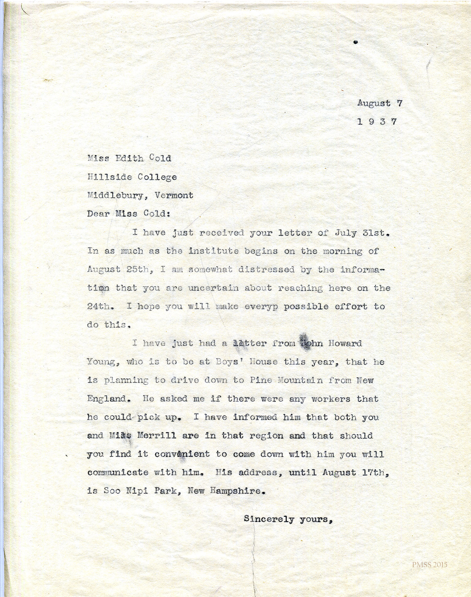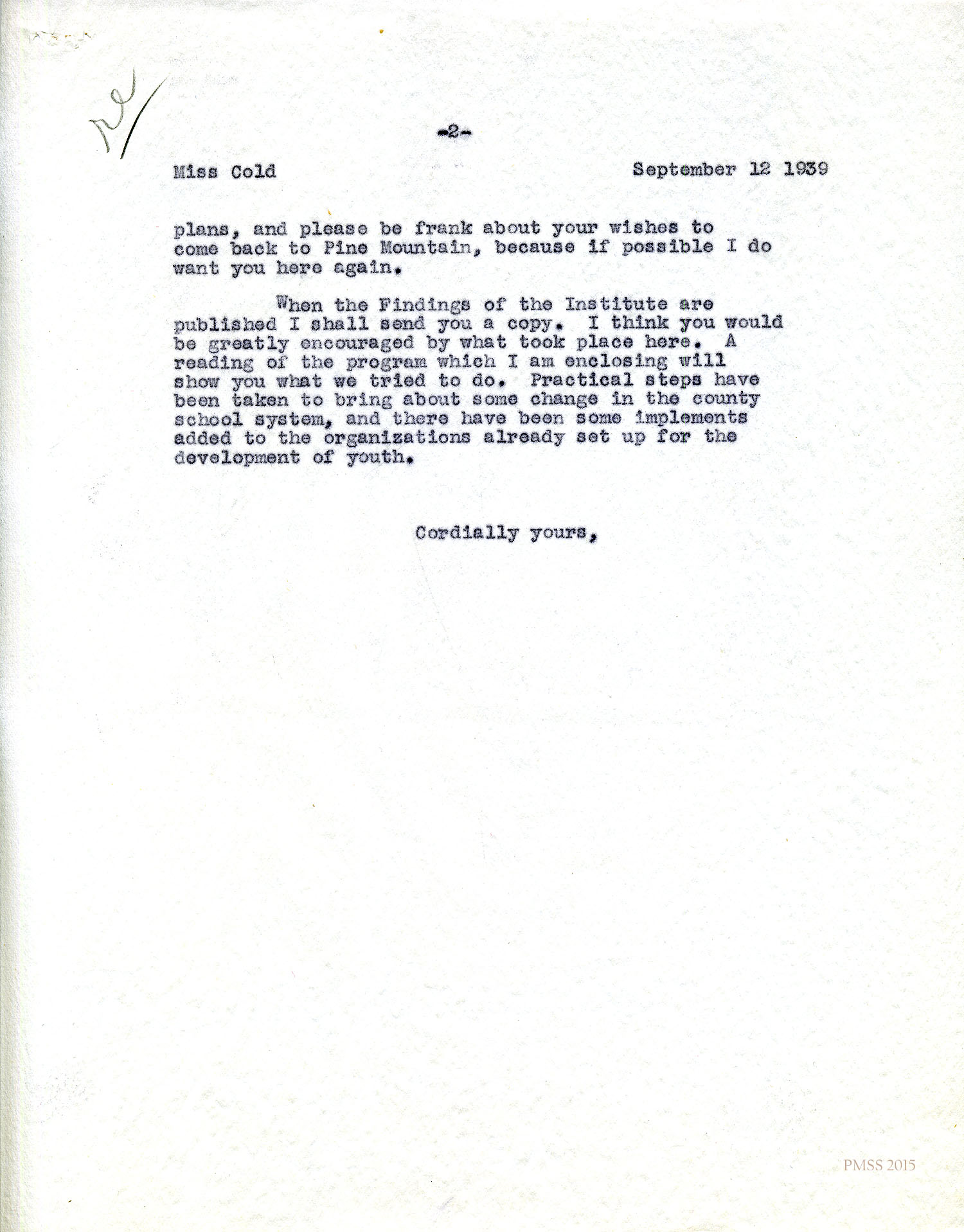 When we talked last year about your leaving Pine Mountain you will recall that I expressed the wish that you would be able to come back here after a year and that we both agreed that while this would be desirable in case circumstances prevent it we were both free to proceed as most expedient. I was unable to secure a volunteer worker for one year, although, up until very late in the summer I had been quite hopeful that I should be able to do so.