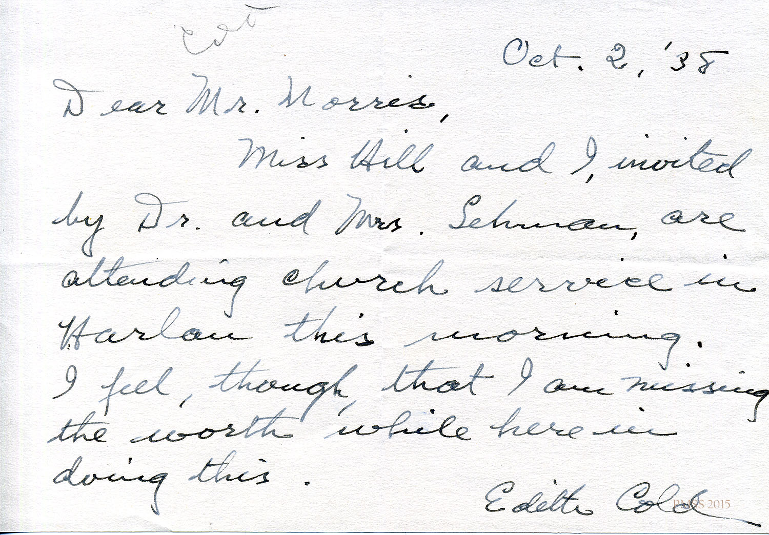 Miss Hill and I, invited by Dr. and Mrs. Scherman [?], are attending church service in Harlan this morning. I feel, though, that I am missing the worth while here in doing this.