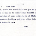 Mr. Morris has asked me to ask you if you would be so kind as to relieve Miss Merrill on Thursdays at noon while she is at Citizenship Committee Meeting, and every other Wednesday at 4:15 p.m.
