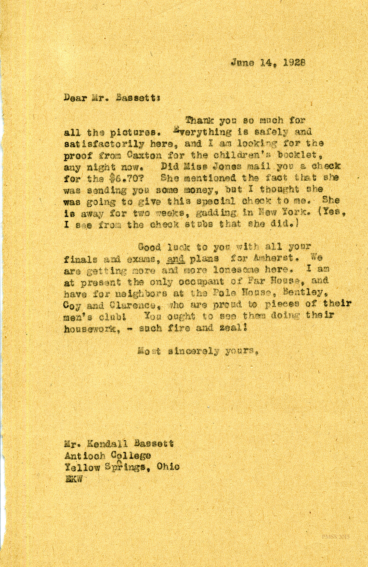 June 1, 1928. EKW (Evelyn K. Wells) to Mr. Bassett. Thanks him for the pictures; awaiting proof from Caxton for children’s booklet. [009]