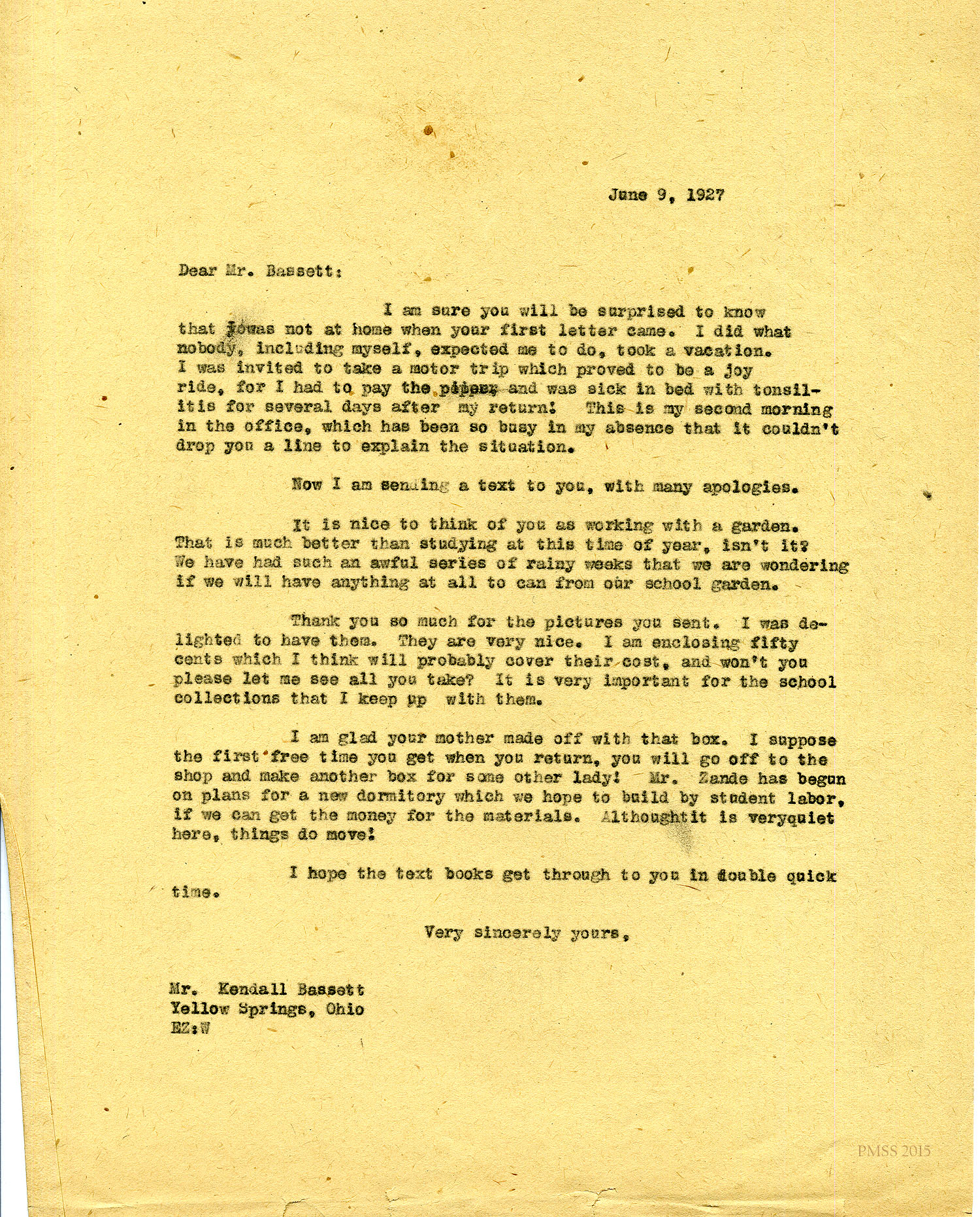 June 9, 1927. EZ (Ethel Zande) to Kendall Bassett, Yellow Springs, OH. Motoring trip; tonsillitis; gardening; received pictures he sent and asked for all he takes to add to the school collections; Mr. Zande is planning new dormitory. [001]