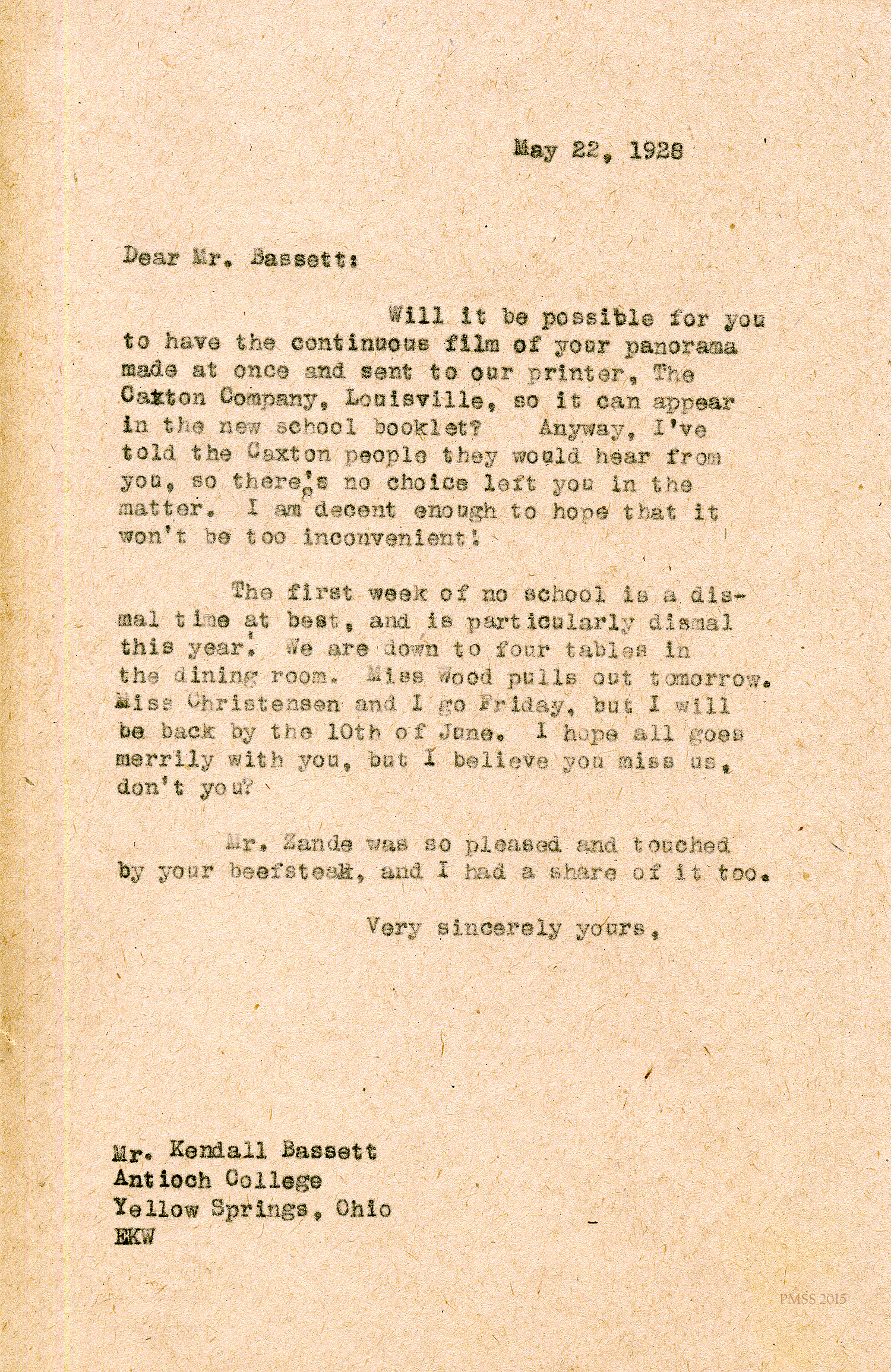 May 22, 1928. EKW (Evelyn K. Wells) to Mr. Bassett. Asks Bassett to send the continuous film of his panorama to the printer, Caxton Co., Louisville, for the new school booklet; describes dismal first week of no school. [008]