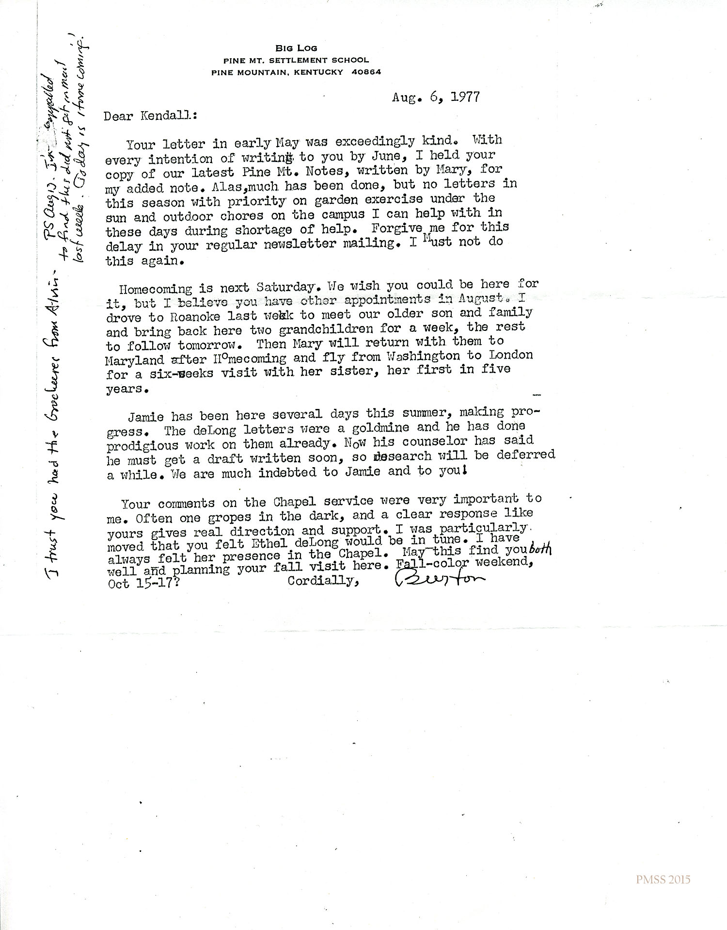 August 6, 1977. “Burton” (Rogers), Big Log, PMSS, to “Kendall” (Bassett). Outside summer work has delayed sending letter and latest Notes; mentions Jamie (Greene)’s work on the de Long letters; “…the de Long letters were a goldmine….”; appreciates Bassett’s comments on Chapel. [012]