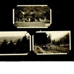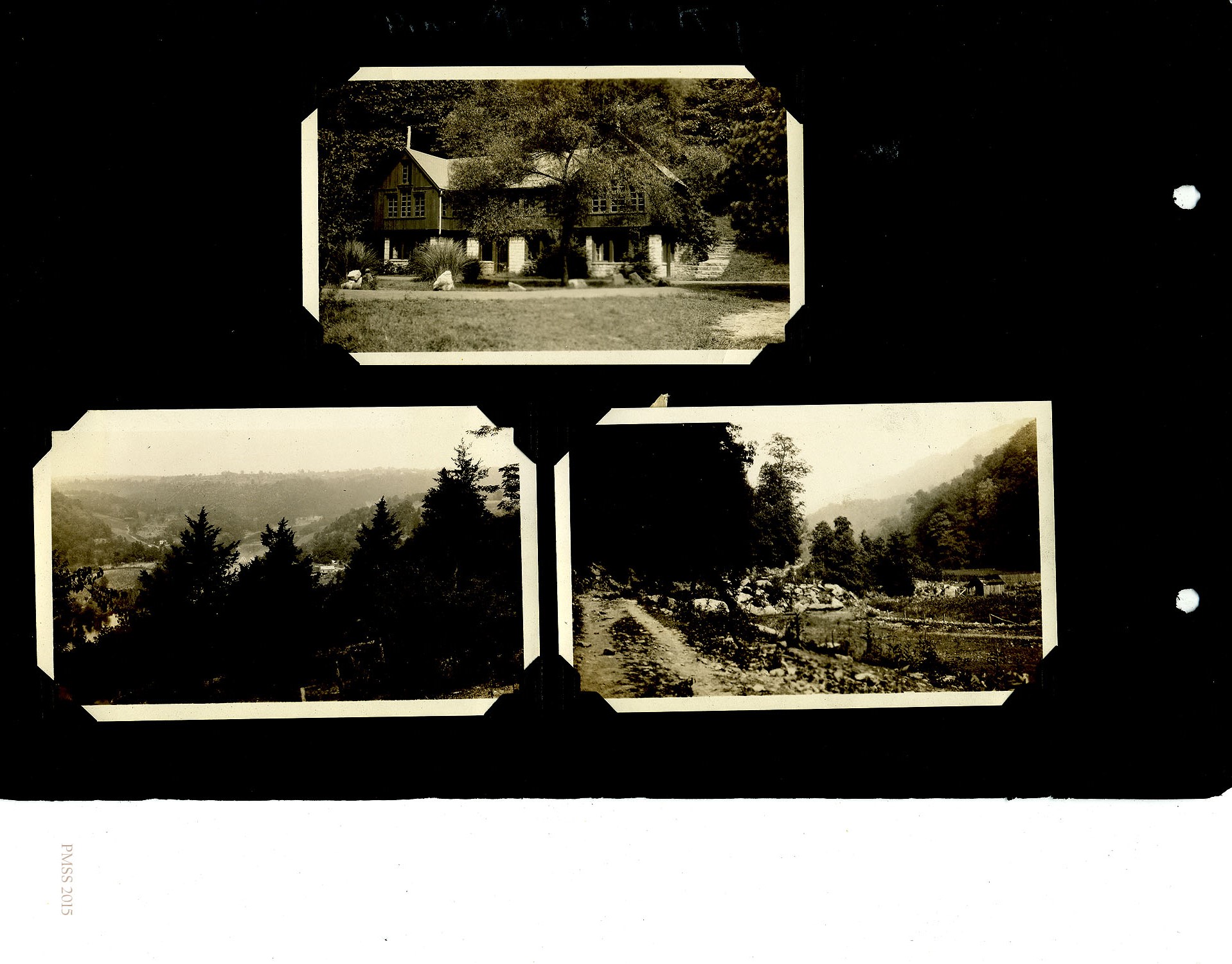 n.d. Three photographs mounted on album page: Boy’s Industrial Building, view of valley from above through pine trees, and dirt road along garden and shed. [014]