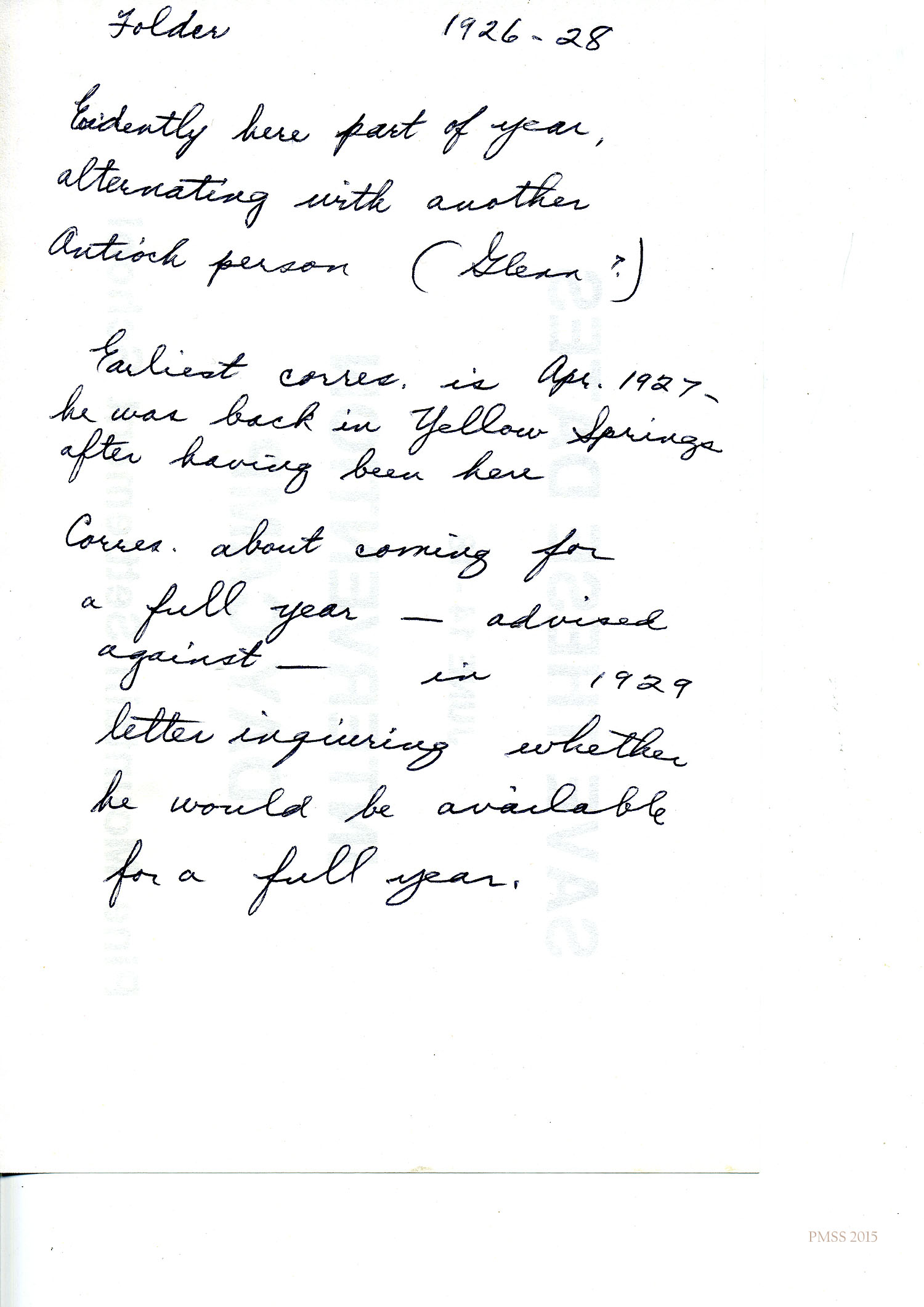 n.d. Handwritten note: “Folder 1926 – 28. Evidently here part of year, alternating with another Antioch person (Glenn?). Earliest corres. in Apr. 1927 – He was back in Yellow Springs after having been here. Corres. about coming for a full year – advised against – in 1929 letter inquiring whether he would be available for a full year.” [005]