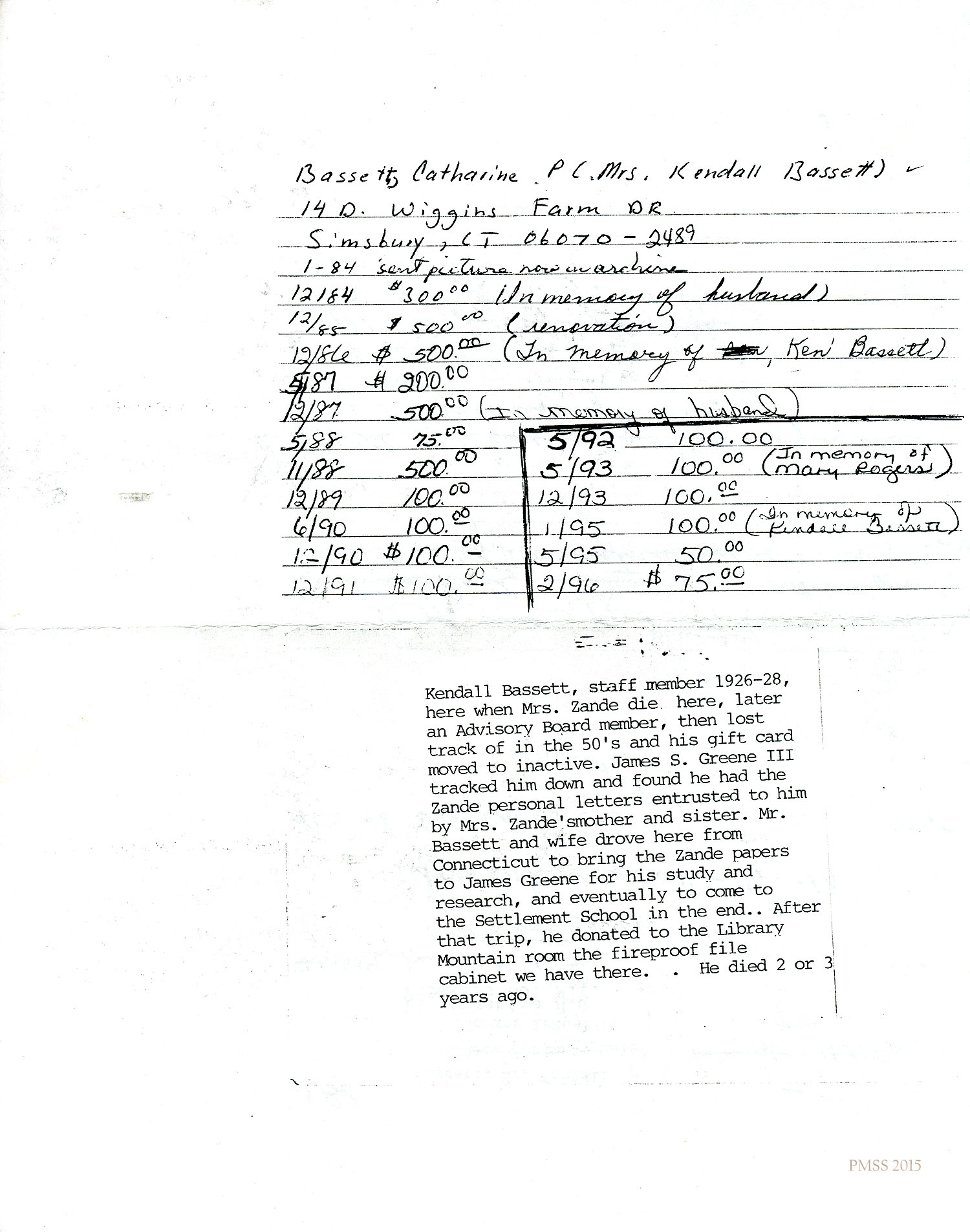 PMSS gift file card with handwritten lists of several changes of addresses and annual donations by the Kendalls from 1934 to 1996, including February 1977 donation of $620 for “file case for PMSS library”. Typewritten note attached is a description of his association with the School during and after his time as a staff member in 1926-1928; Lost track of him in the 1950; James S. Green III reconnected with him again and received Mrs. (Ethel de Long) Zande’s papers and a fireproof file cabinet from him. [006 – 006a]