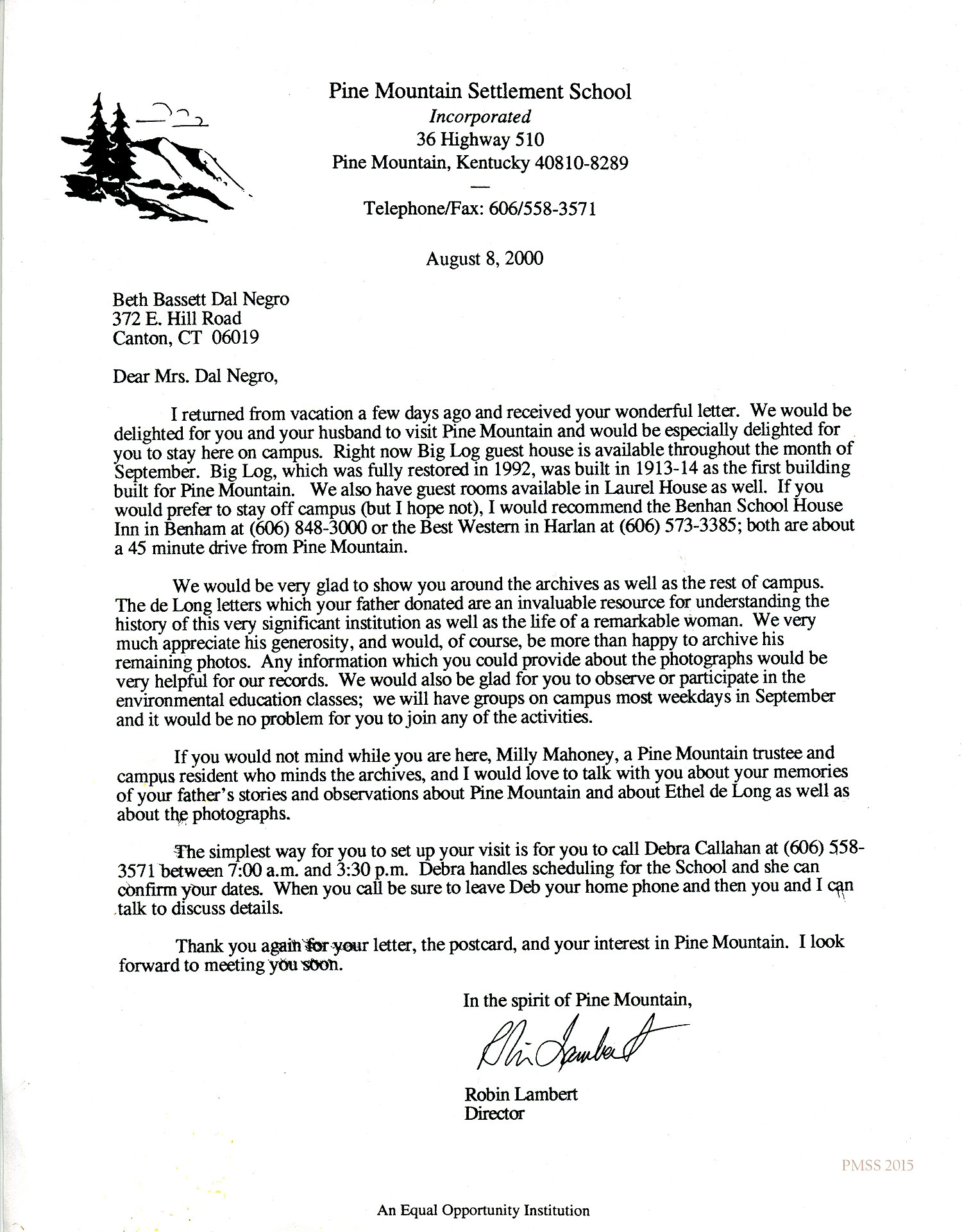 August 8, 2000. Robin Lambert, Director, to Mrs. (Beth Bassett) Dal Negro. Welcomes their visit and offer of photographs; describes accommodations in Big Log or Laurel House; suggests a meeting with Milly Mahoney, “Pine Mountain trustee and campus resident who minds the archives”; schedule with Debra Callahan. [008]