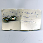 n.d. Handwritten note accompanying a costume pin shaped as a sideways figure eight: “…pin belonged to Helen de Long…ister start…Pine Mt. School…..ice aquamarines.” [001]