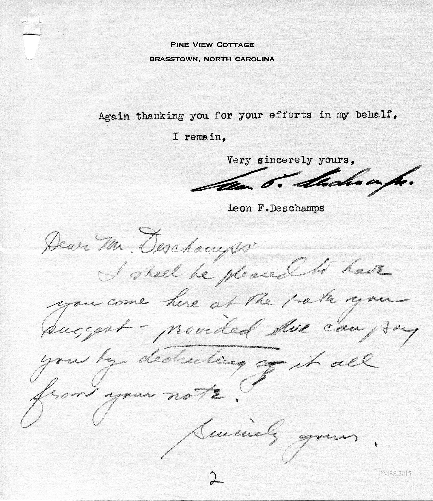 Deschamps in Swannanoa, NC, to “The Director” at PMSS: Asks for a copy of the PMSS calendar.