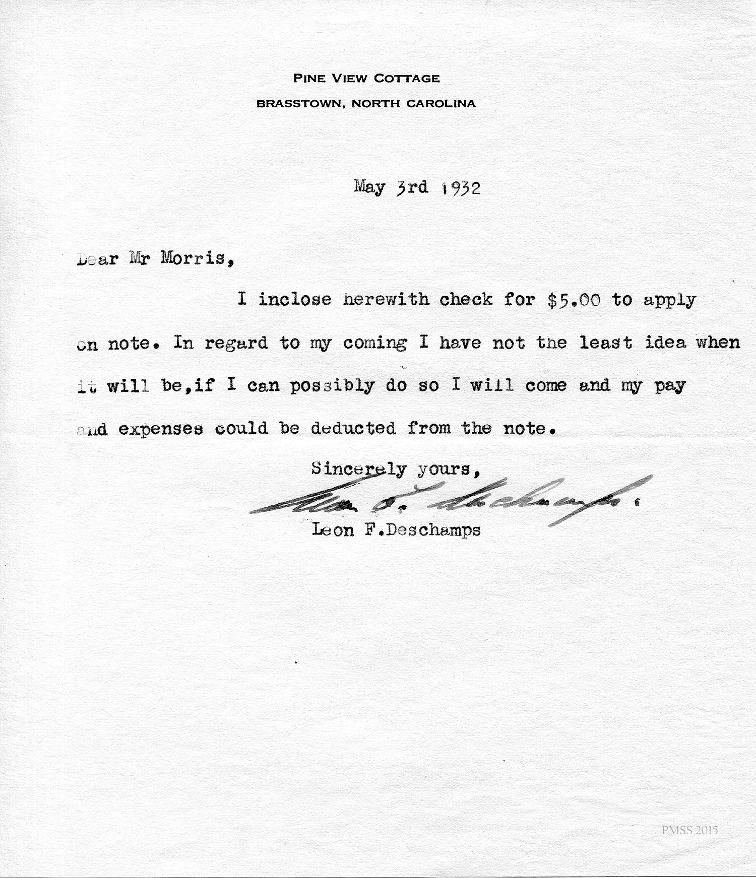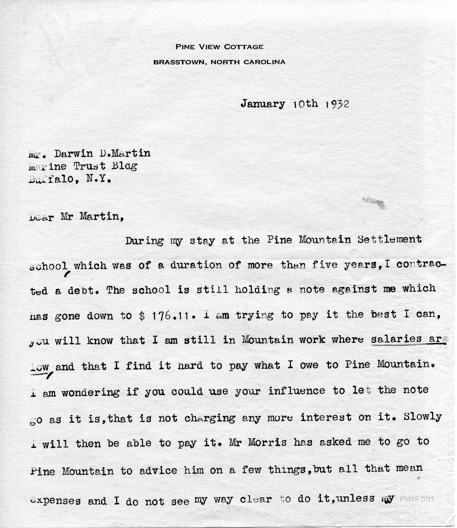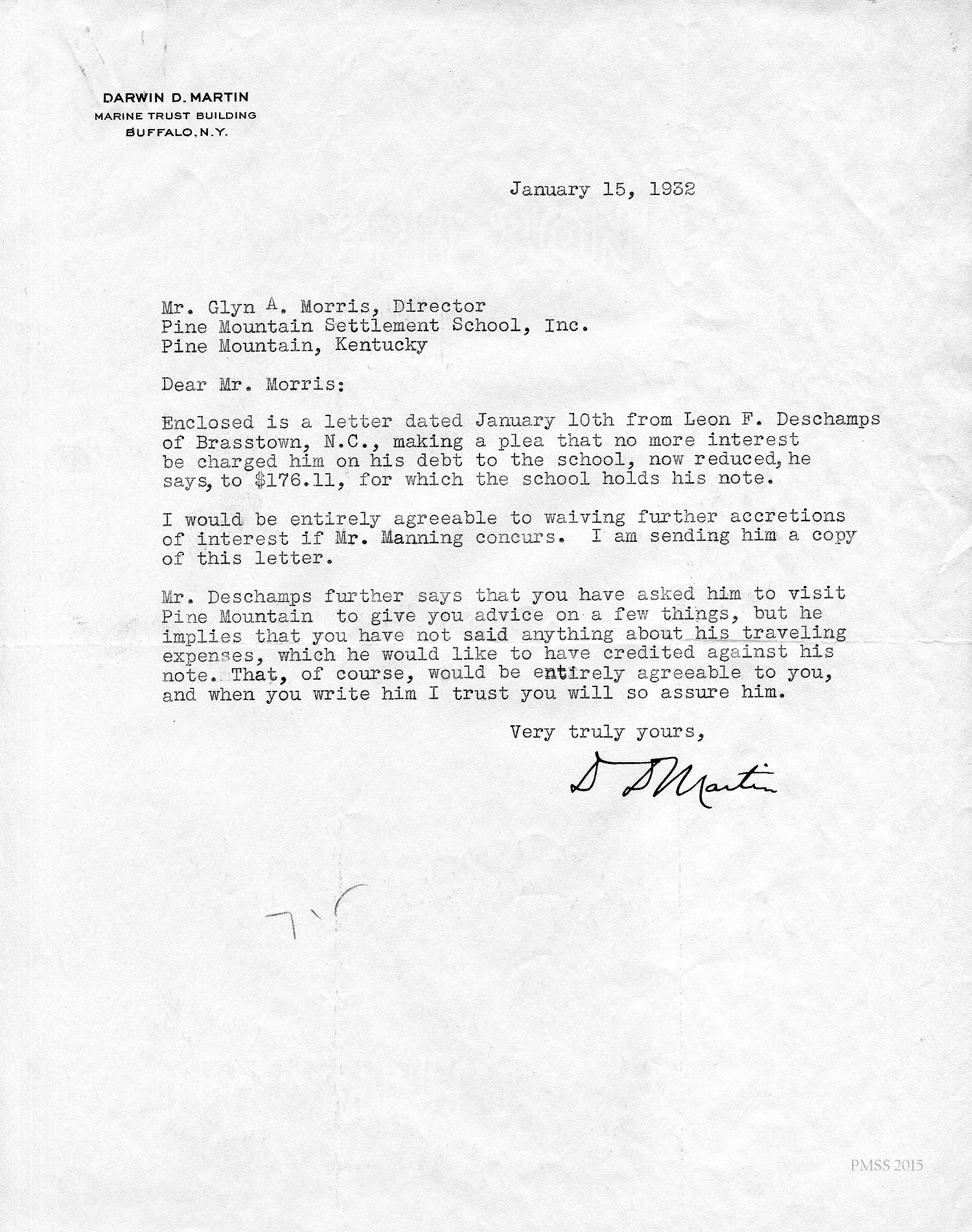 Deschamps in Brasstown, NC, to Darwin D. Martin in Buffalo, NY: Asks Martin to use his influence to remove interest charges from his PMSS debt; Morris has asked Deschamps to visit PMSS for consultation but must credit travel expenses against the debt; visited Mr. Zande in Asheville, NC.