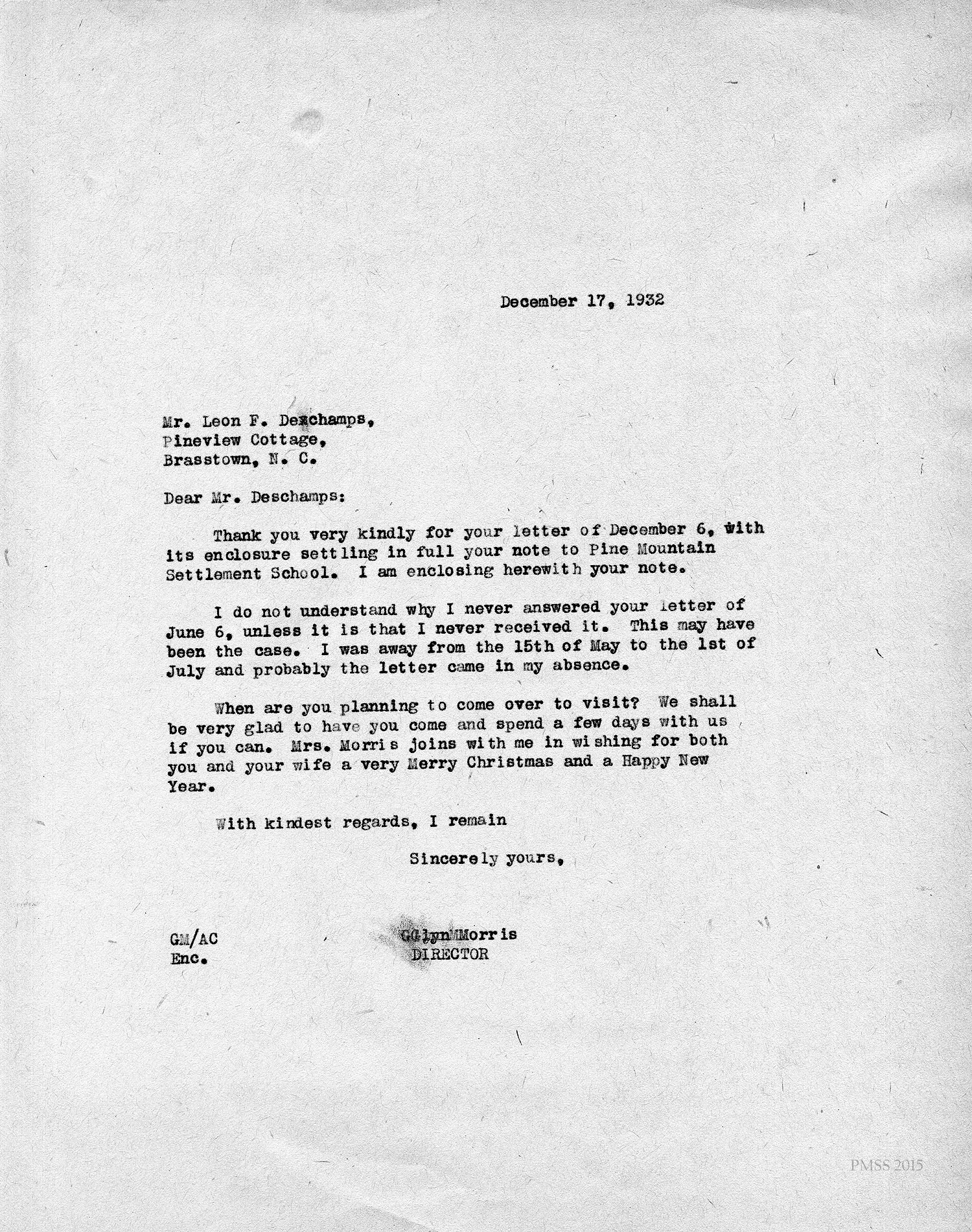 Deschamps to Morris: Too busy at Campbell Folk School to come to Pine Mountain.