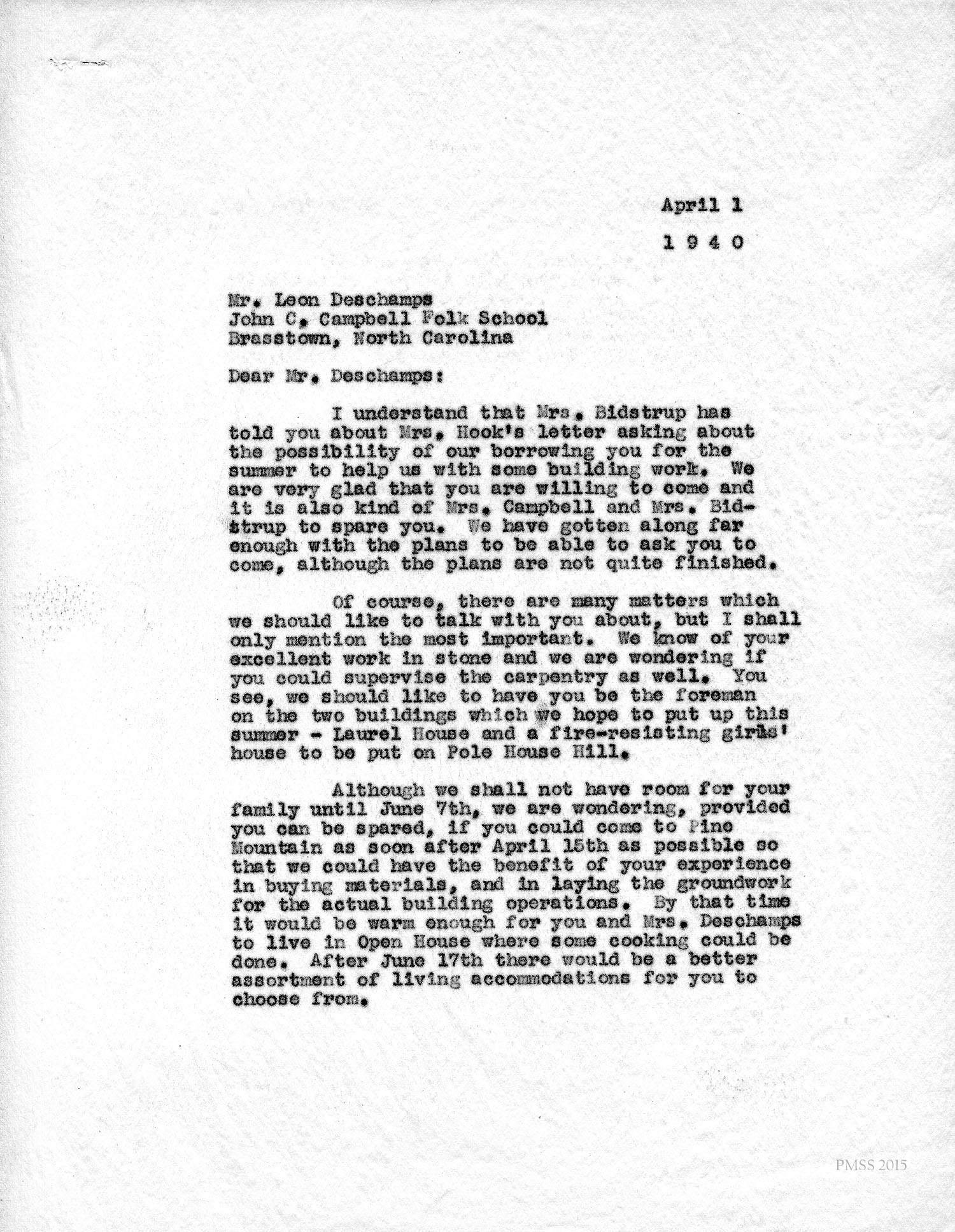 [unsigned] to Deschamps: Welcomes Deschamps to PMSS to spend the summer to help Mrs. (Mary Rockwell) Hook with stonework and carpentry; asks him to be foreman for the construction of Laurel House and girls’ house on Pole House Hill; states living arrangements and terms.