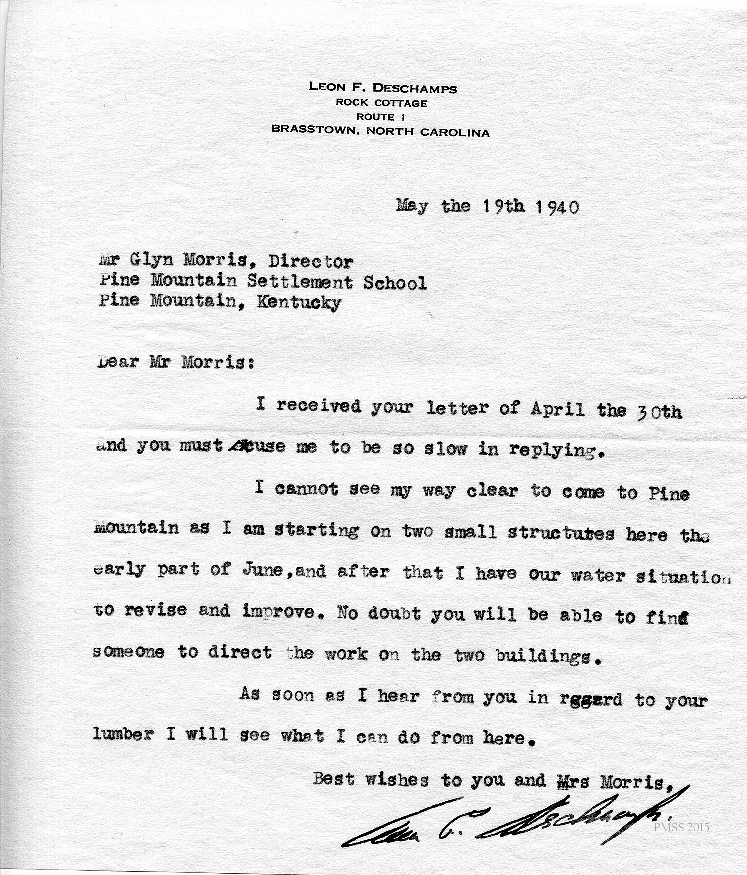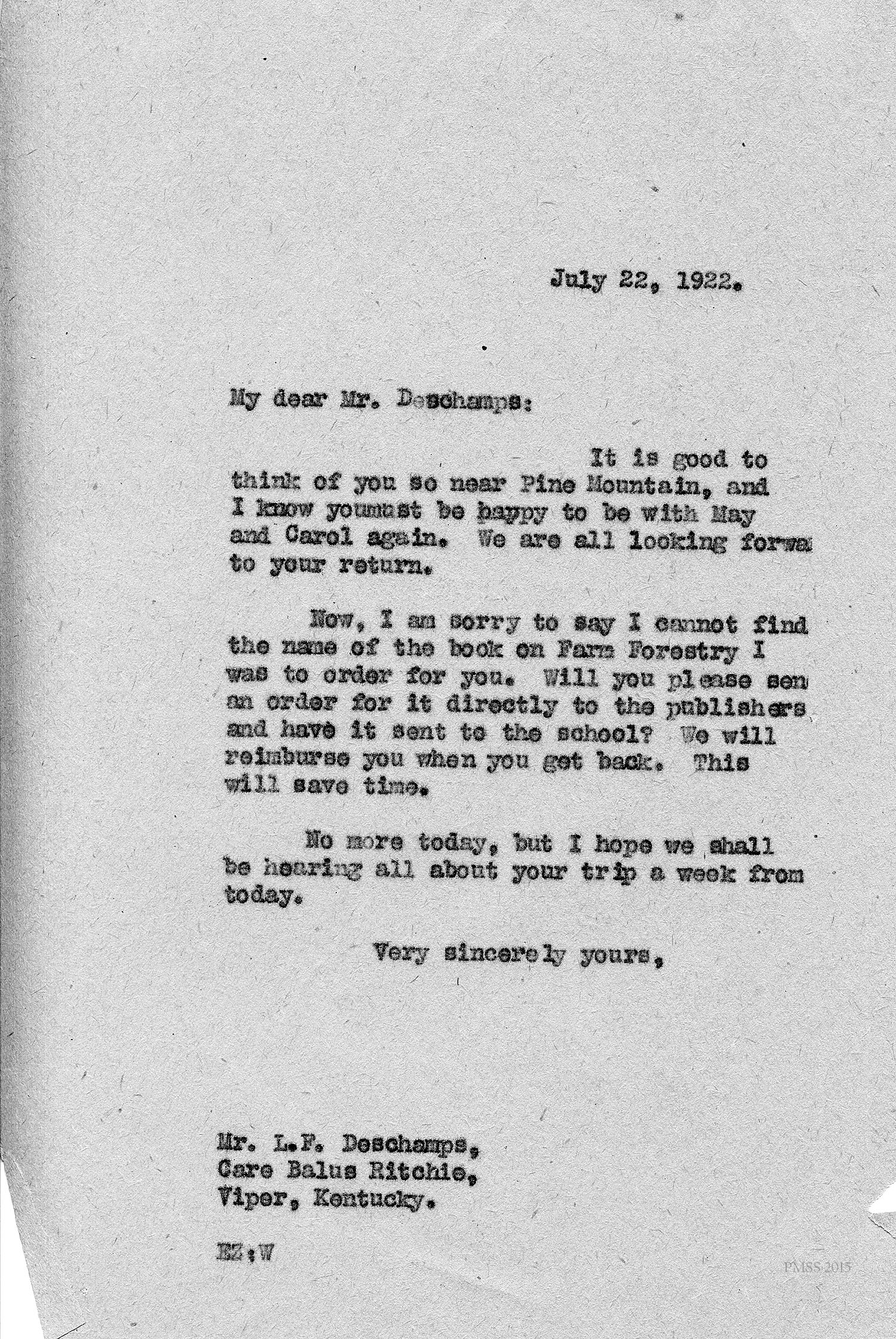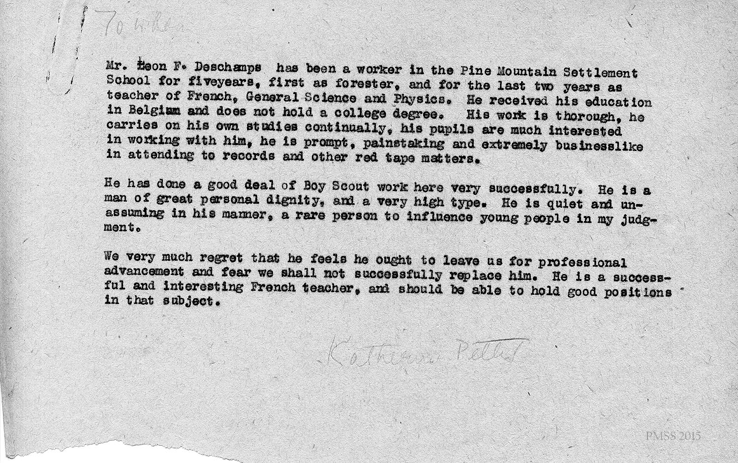 TAGS:  Leon Deschamps Correspondence ; Pine Mountain Settlement School ; May Ritchie ; Ritchie family ; WWI ; Belgium ; forestry ; farming ; agriculture ; forest fires ; silviculture ; architecture ; French ; construction ; education ; industrial training ; Katherine Pettit ; Milford, PA ; Mr. Browning ; Ethel de Long Zande ; Mr. Browning ; Luigi Zande ; Lexington, KY ; Carol Deschamps ; Mr. Manning ; Evelyn Wells ; Elizabeth Hench ; George Peabody College ; Nashville, TN ; Bognert Bros. ; Mrs. John C. Campbell ; job search ; letters of recommendation ; Perfect Acre ; John C. Campbell Folk School ; Brasstown, NC ; Hubert Hadley ; Glyn Morris ; reservoir ; Darwin D. Martin ; (Mary Rockwell) Hook ; Swannanoa, NC ; Mildred Mahoney ;