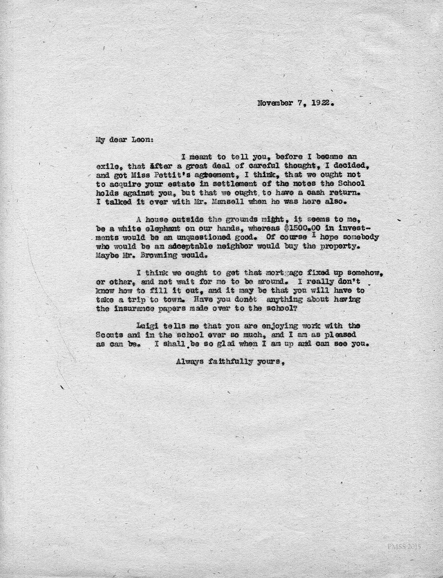 [unsigned] to Leon: Miss Pettit and I agree that PMSS ought not to acquire Leon’s estate in settlement of the notes the School holds against him, but that the School should have a cash return; Mr. Mensell agrees; Mr. Browning; mortgage; insurance papers; Luigi (Zande).