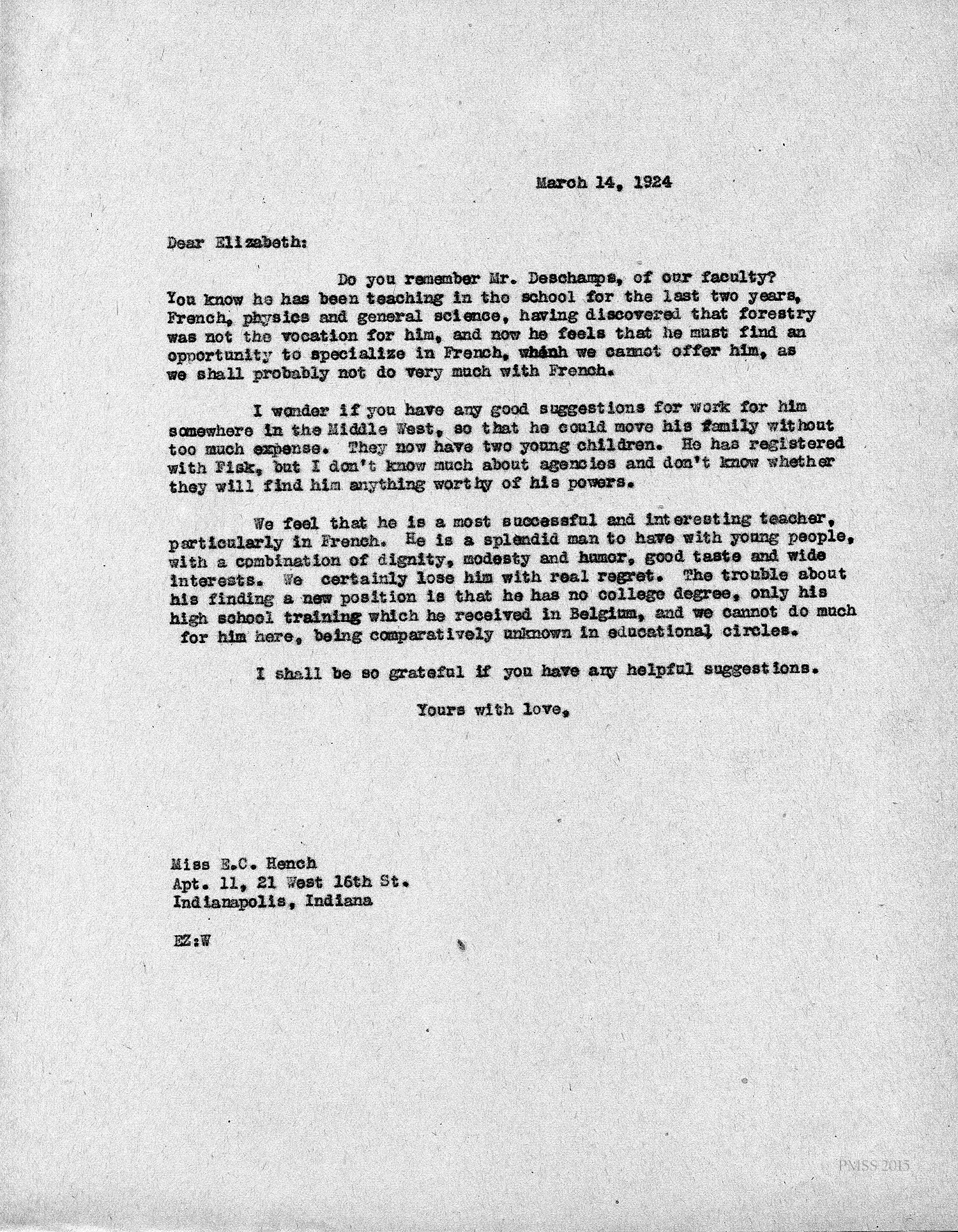 [unsigned] “EZ” (Ethel Zande) to Miss Mina Kerr, Executive Secretary, AAUW, Washington, DC: Asks for suggestions for young man (Deschamps) who has given up forestry and has been teaching French, physics and general science at PMSS; wants to specialize in French, which isn’t needed at PMSS; describes his credentials.