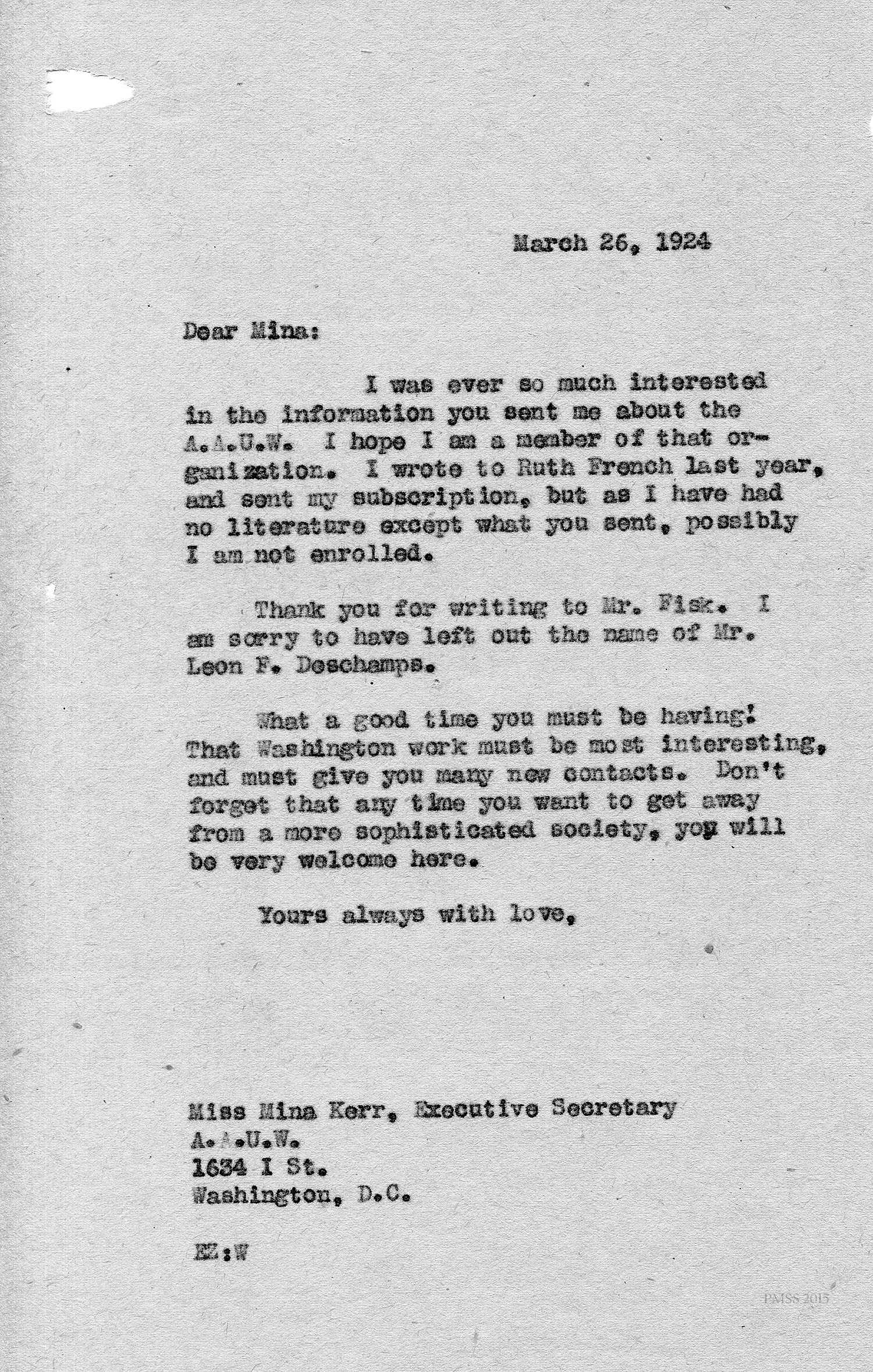 Mina Kerr, Exec. Secy., American Association of University Women in Washington, DC, to “Ethel” (DeLong Zande): Responding to March 14 letter: Will forward Deschamps’ name to Mr. Fisk, whom she knows well; AAUW information.