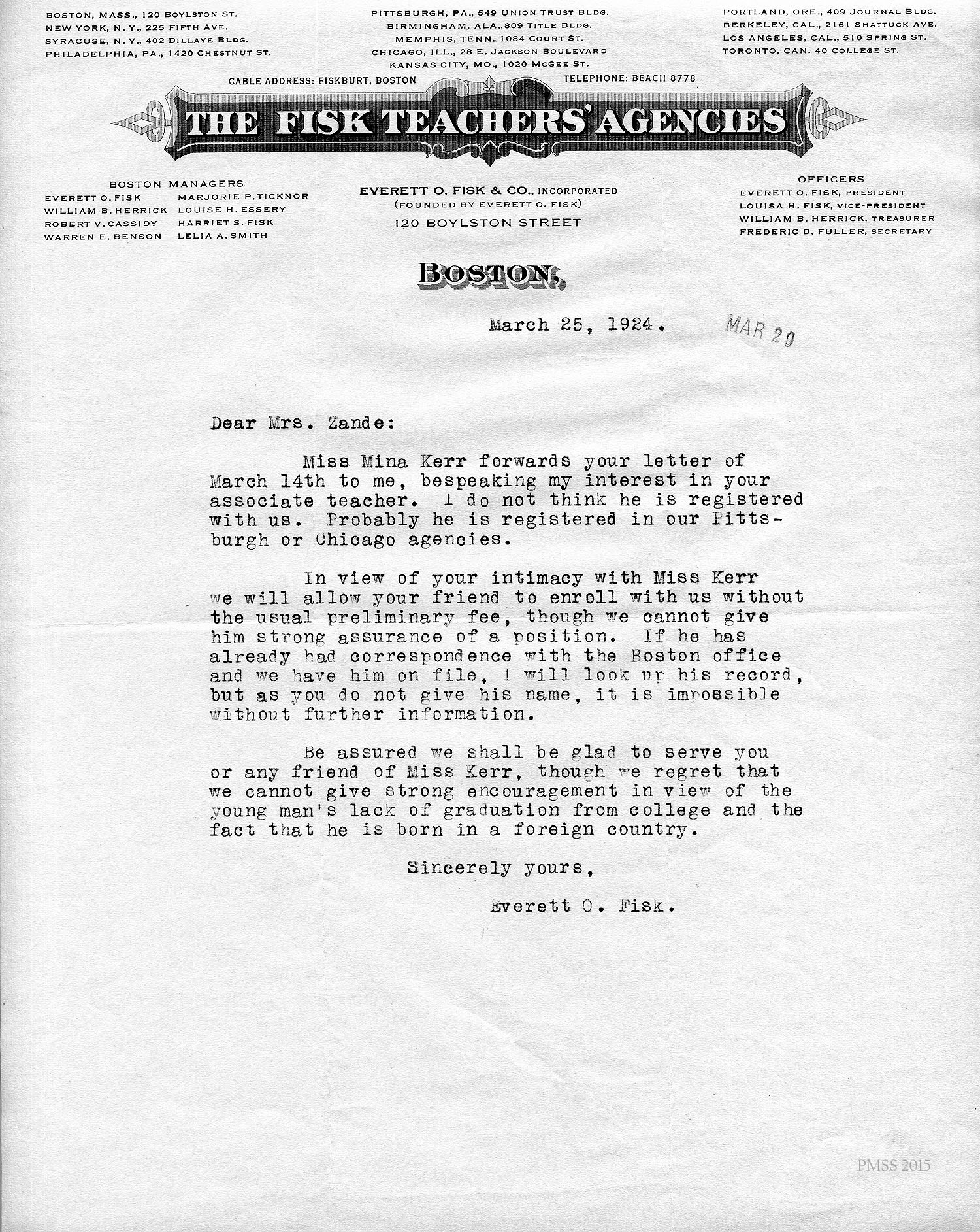 Everett O. Fisk to Mrs. Zande: Received copy of Zande’s letter from Miss Kerr; will waive Deschamps’ registration fee; cannot give strong encouragement because of his lack of a college degree and that he is “born in a foreign country.”