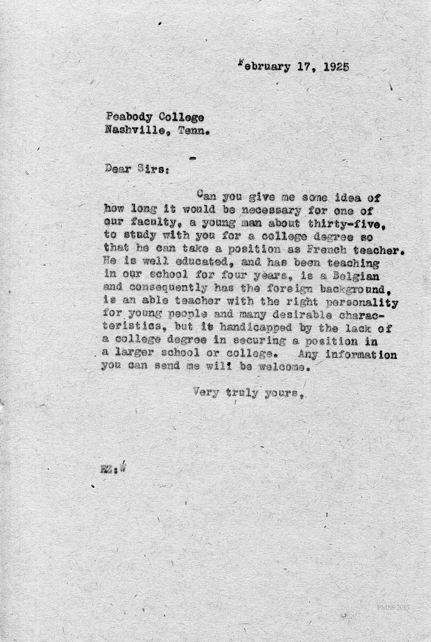 [unsigned] “EZ” (Ethel Zande) to “Sirs” at Peabody College, Nashville, TN: Asks about length of time to study for a college degree to teach French.